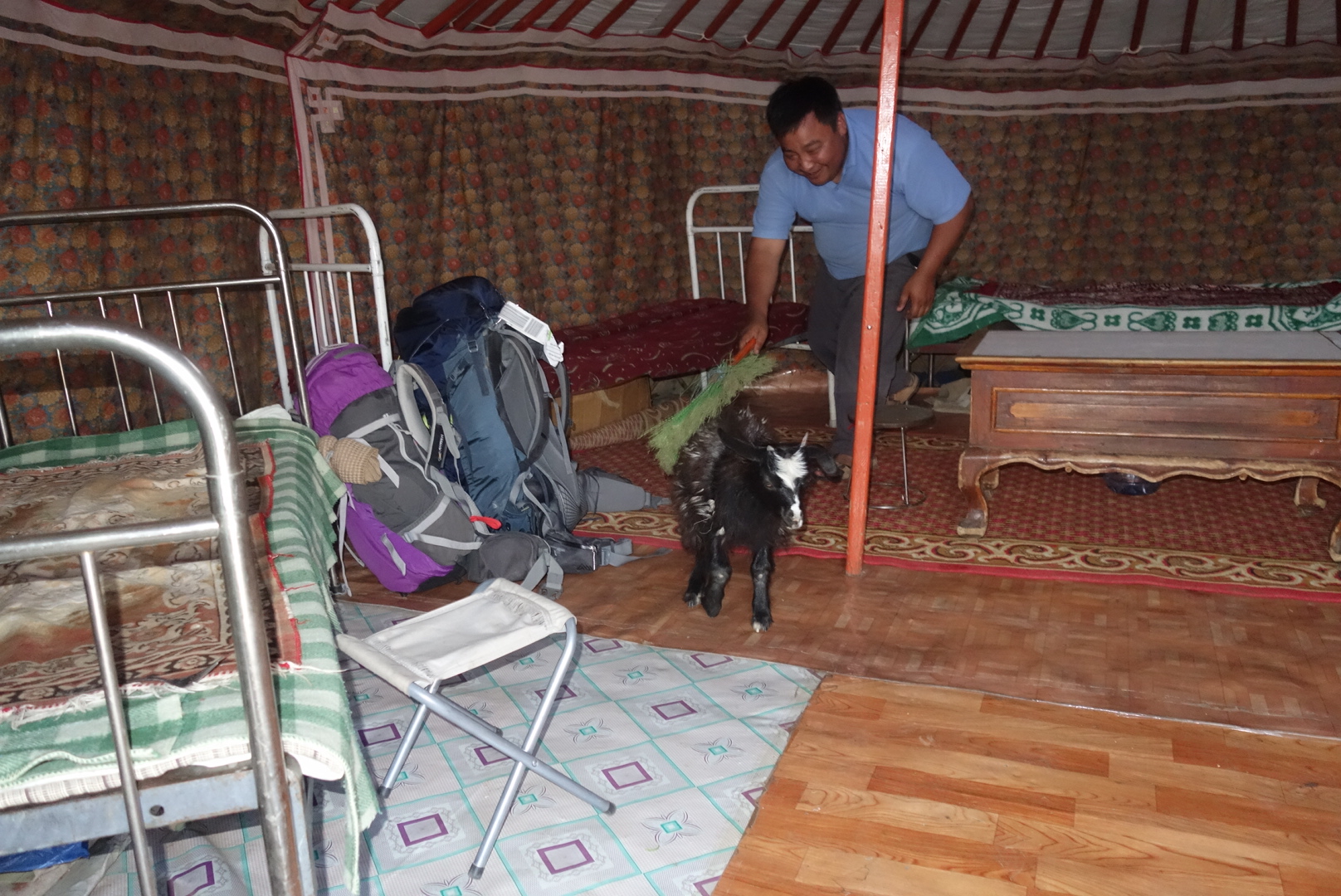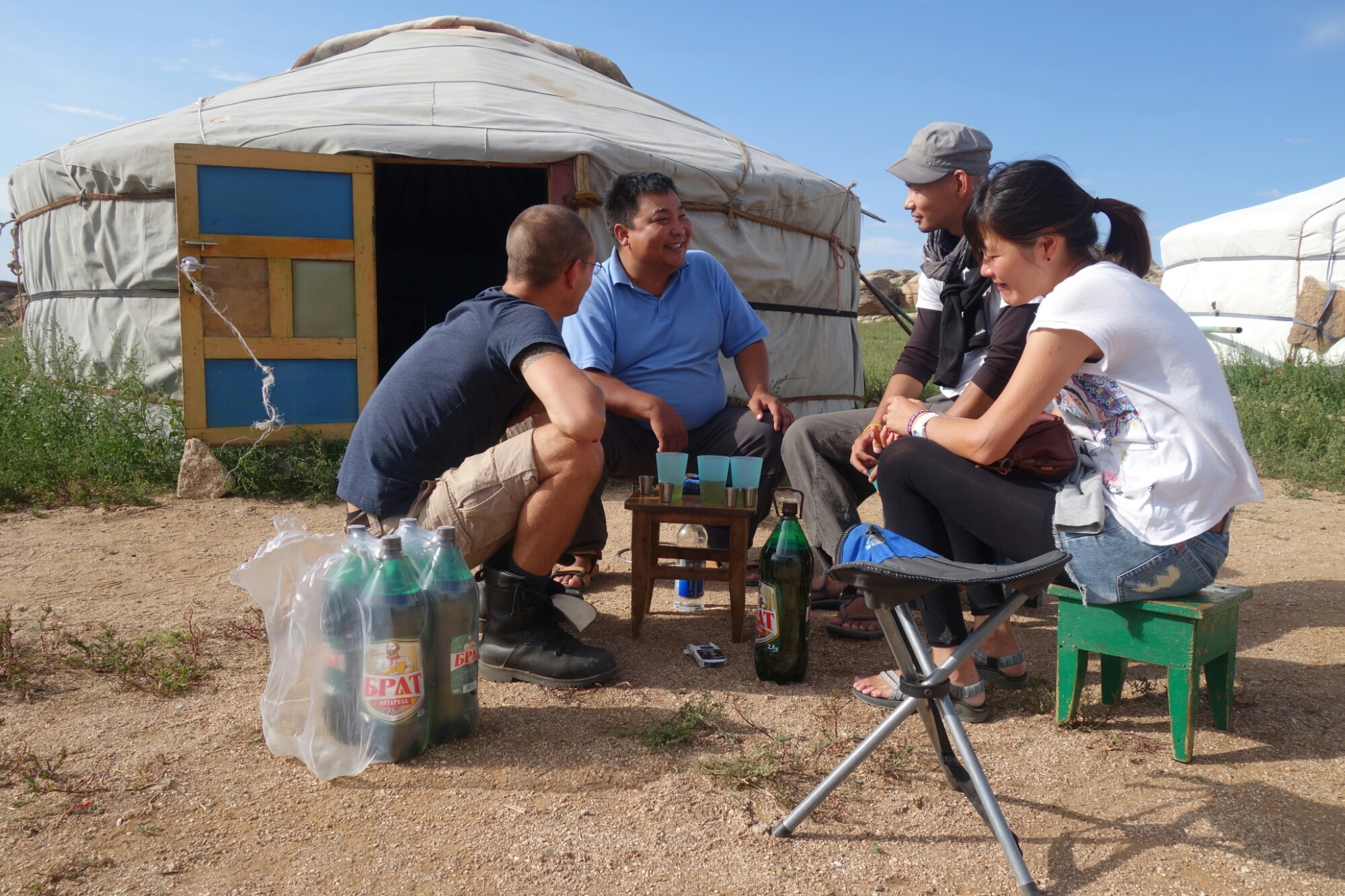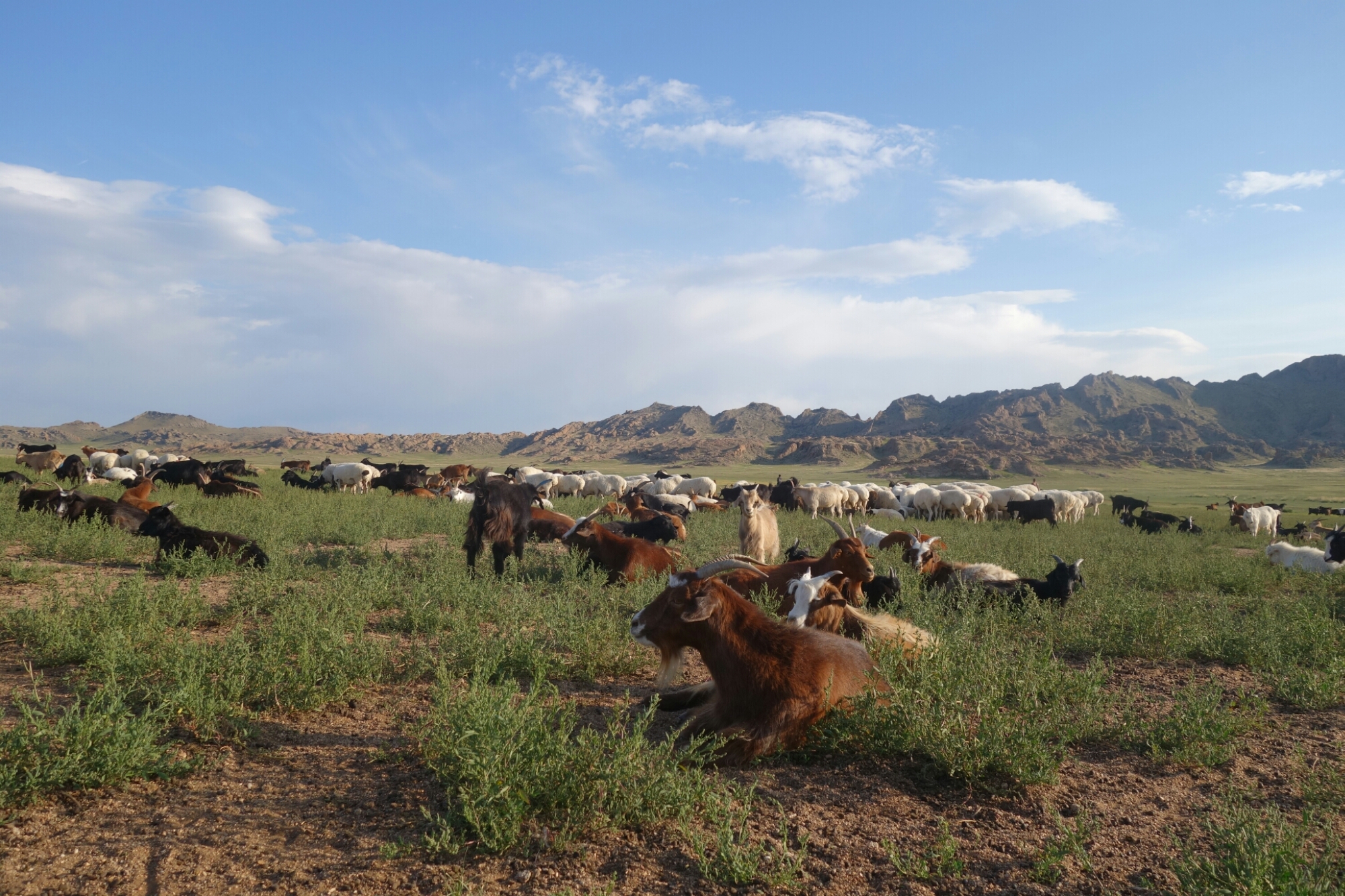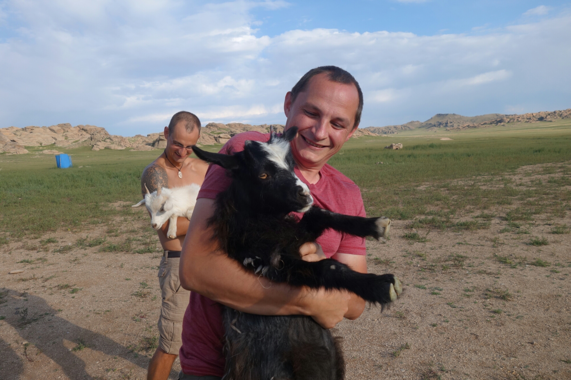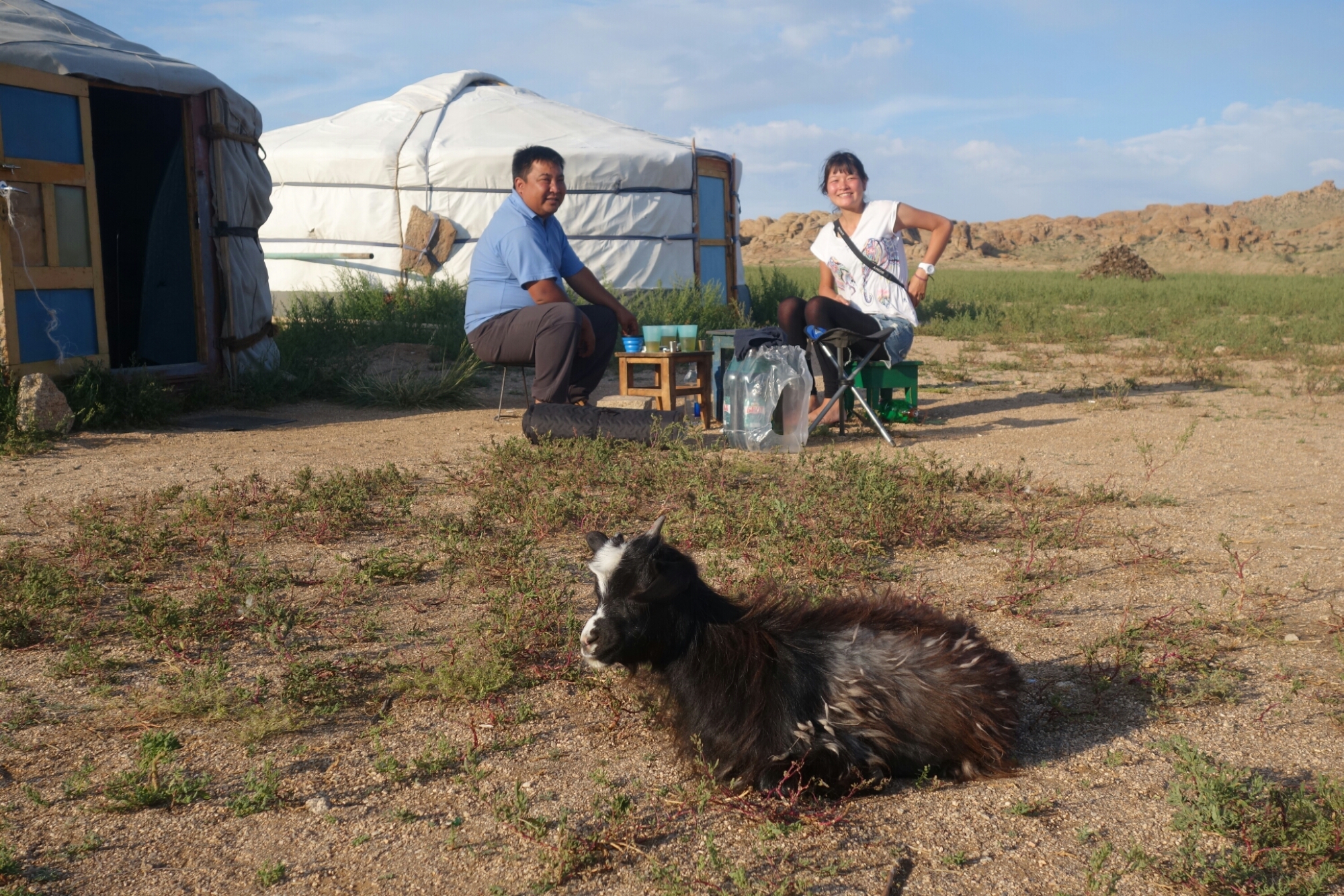 Irgendwann wird unsere gemütliche Runde aber gestört, weil eine Herde Ziegen im Anmarsch ist und 2 der Tierchen ziemlich neugierig sind und anscheinend auch gern ein Schlückchen von unserem Bier oder dem guten Chinggis Vodka probieren würden.