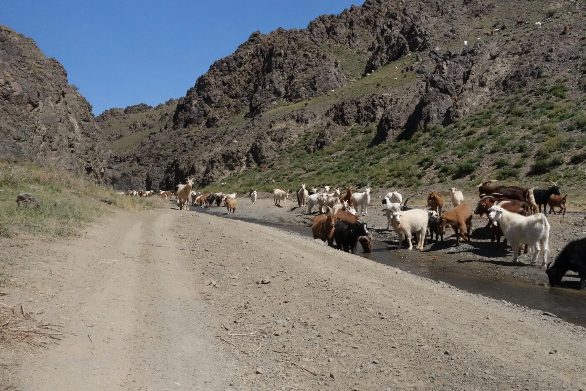Da man hier kein Obst und auch kaum Gemüse aber dafür Ziegen und Schafe im Überfluss hat, gibt es meist Fleisch mit Reis oder Nudeln und etwas Gemüse. Diese Kombination dann entweder gebraten oder mit Wasser als Suppe. In den Städten gibt es auch oft mit Fleisch gefüllte Teigtaschen die den wunderbaren Namen Buuz.