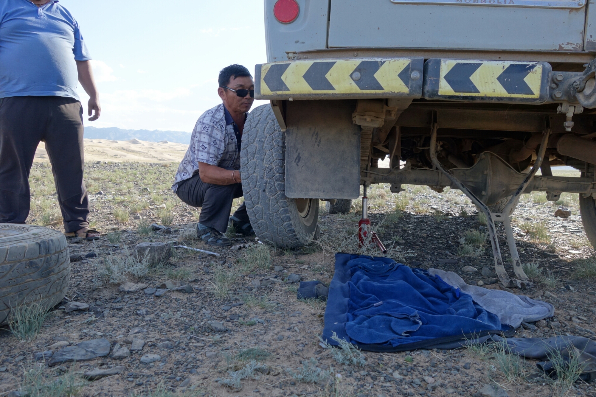 Wir fahren weiter immer parallel zu den Sandmassen und selbst ein platter Reifen kann uns nicht lange davon abhalten unser heutiges Ziel welches aus ein paar Jurten etwa 1 Kilometer vom Sand entfernt zu erreichen.