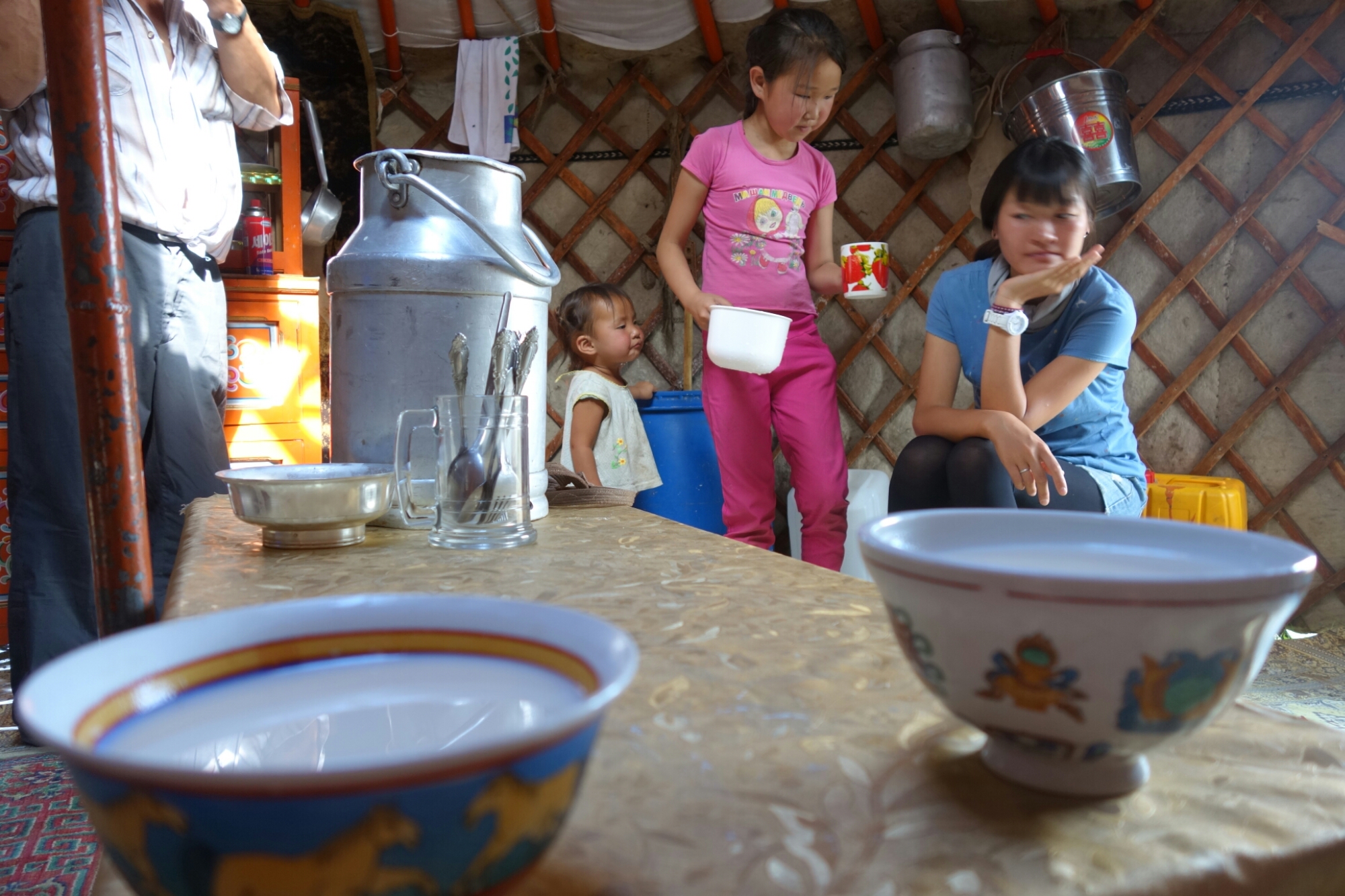 Wir werden in das Ger gebeten und jeder von und bekommt von einem etwa 12 jährigen Mädchen eine riesige Schüssel mit vergorener gorener Stutenmilch und einen von meinen ach so „heiß geliebten“ harten Zigen-Joghurt-Crackern.