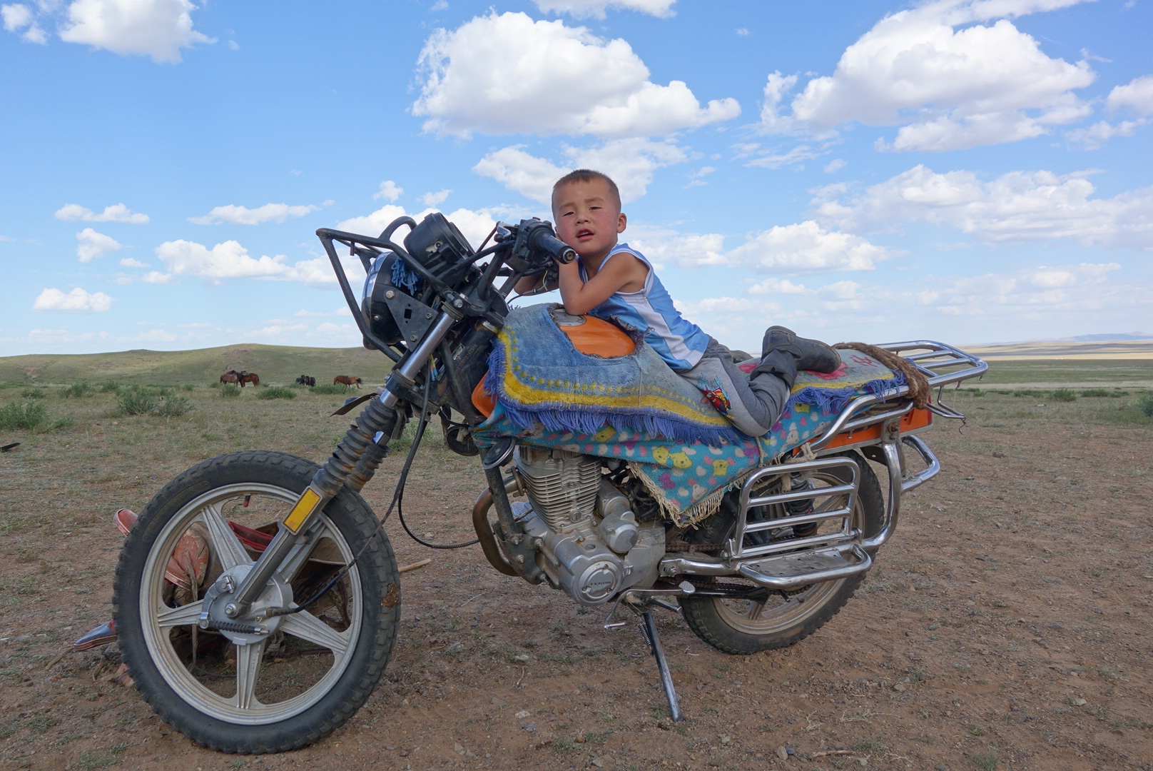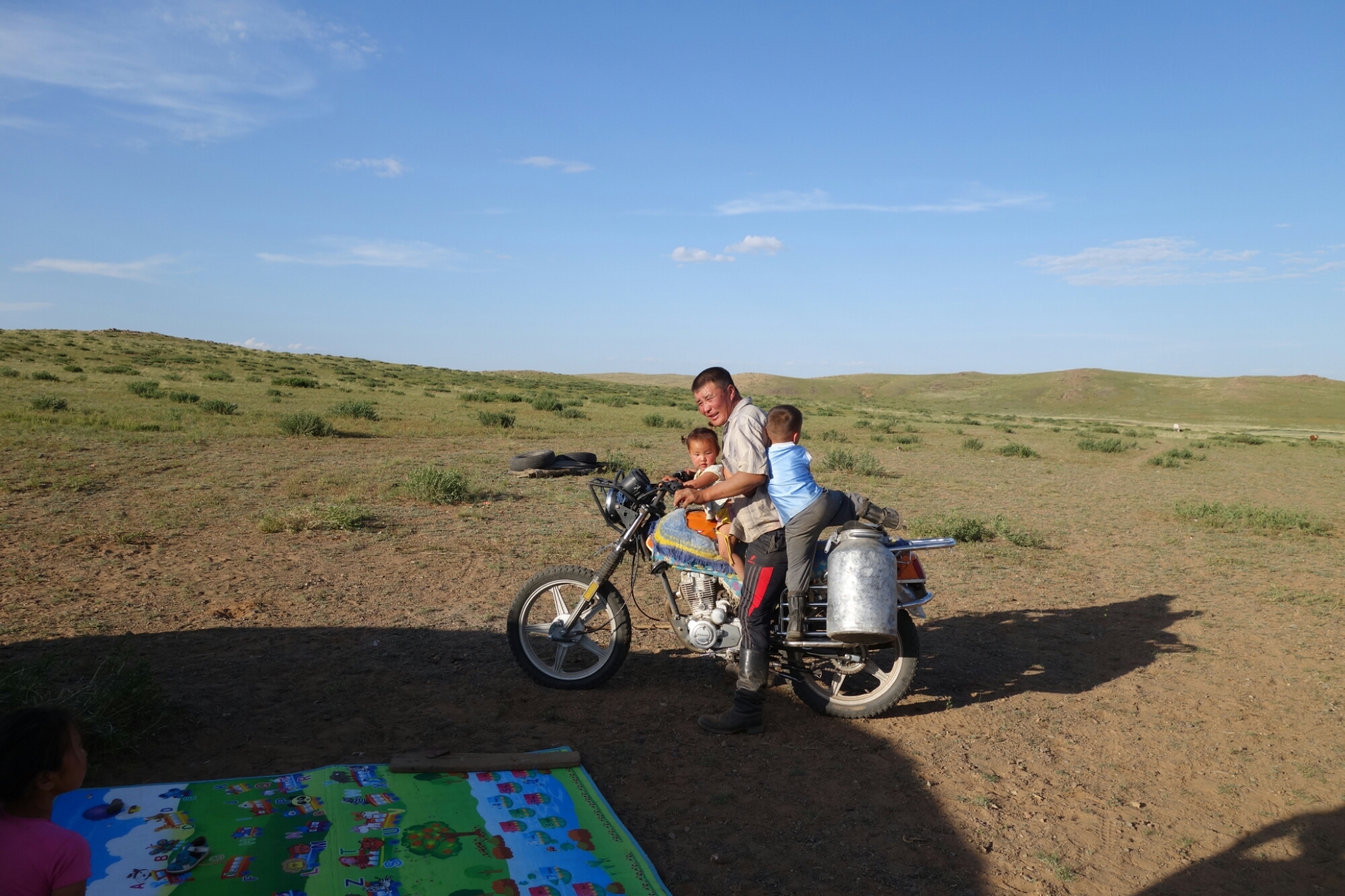 Nach etwa 20 Minuten kommen dann auch Tugsuus Schwager und seine Frau mit dem Motorrad angebraust und wir bekommen noch mehr von der Stutenmilch serviert.