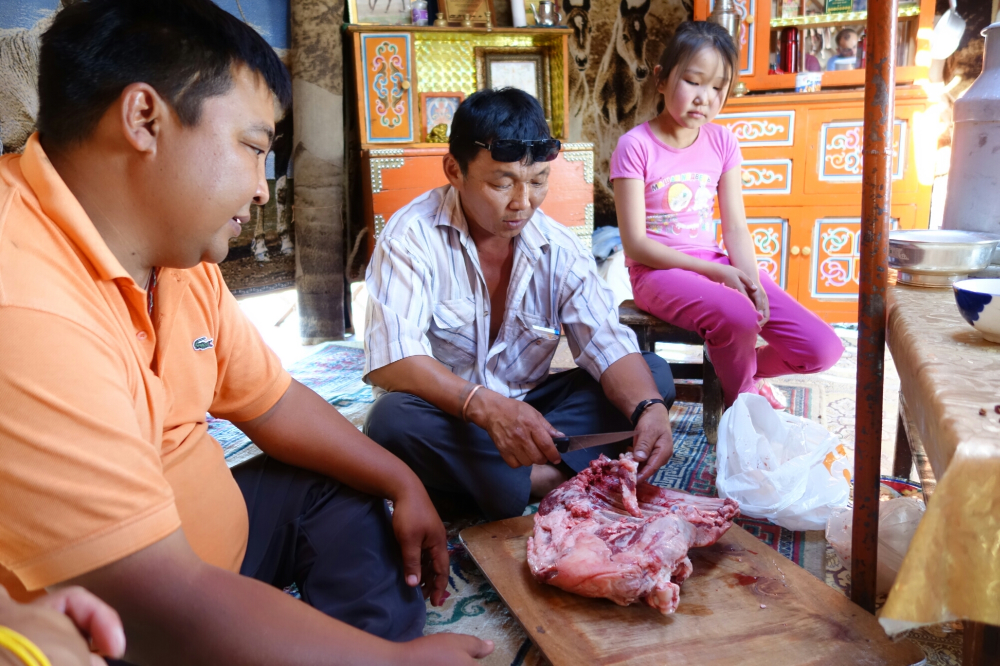 Dann werden Schneidebrett und Messer gebracht und Beißa beginnt mit Tugsuus hilfe unser riesen Stück Fleisch zu zerlegen.