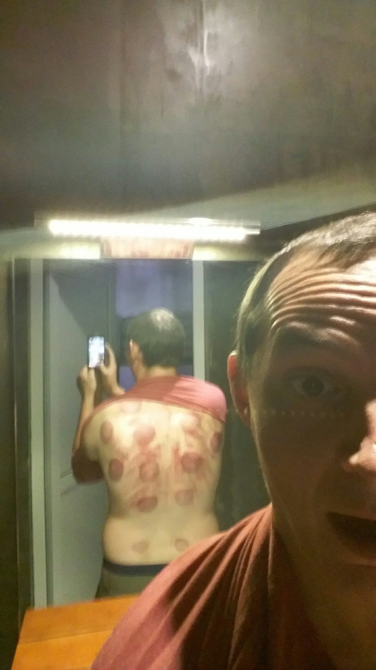 Ich beschließe das Beste draus zu machen, knipse ein Foto von meinem Rücken und schicke das Bild mit dem Passenden Text an alle möglichen Freunde.