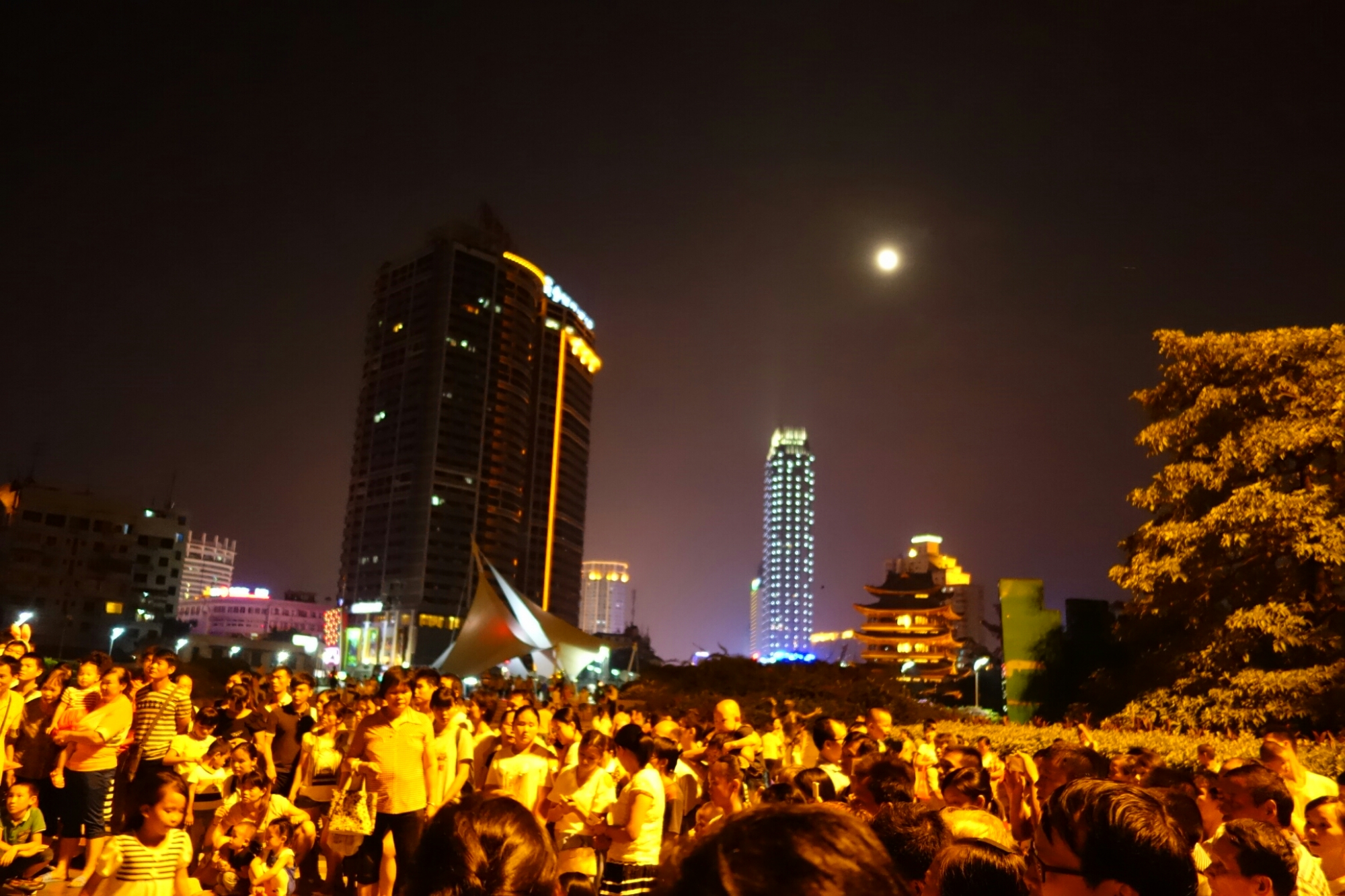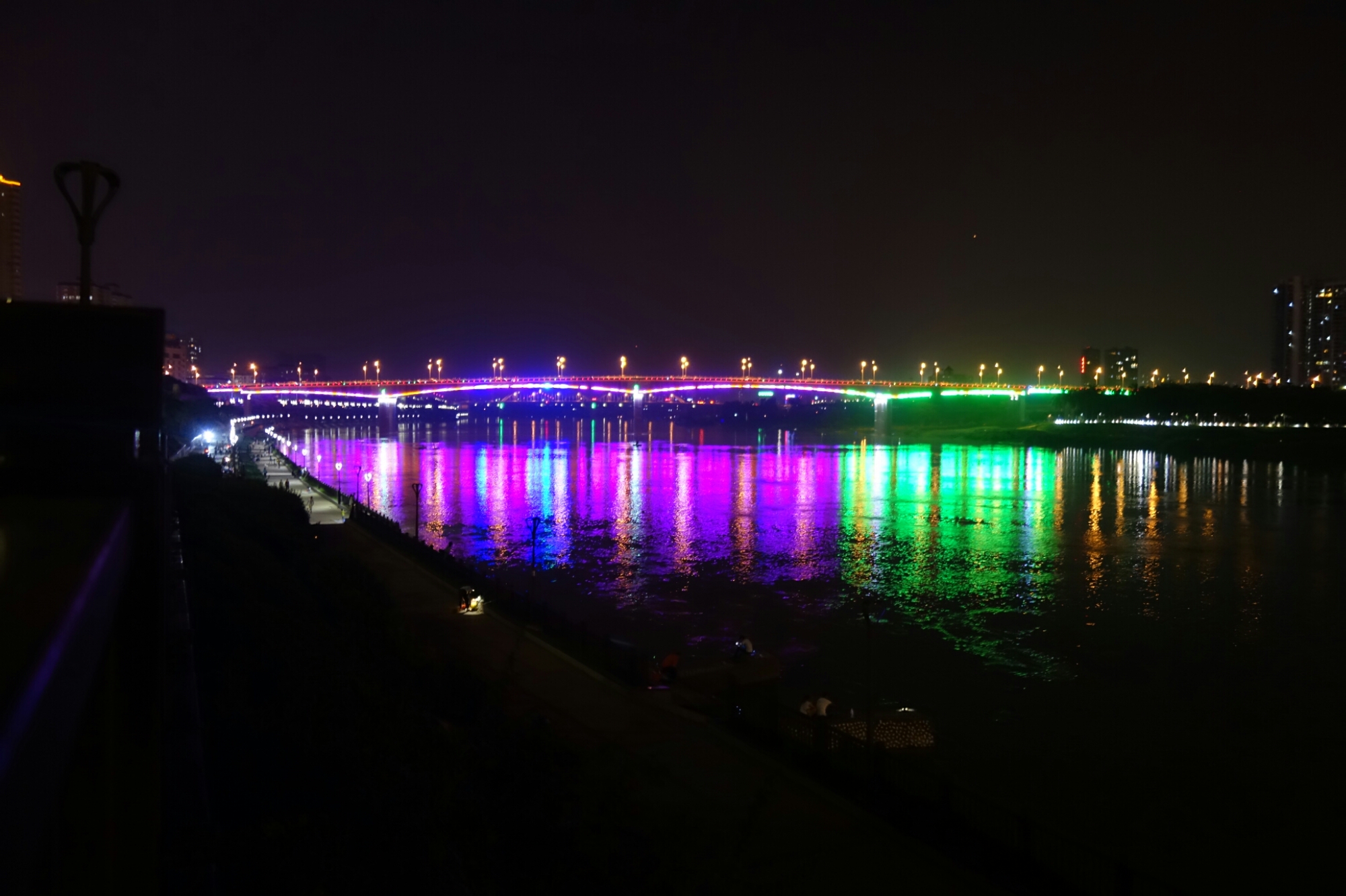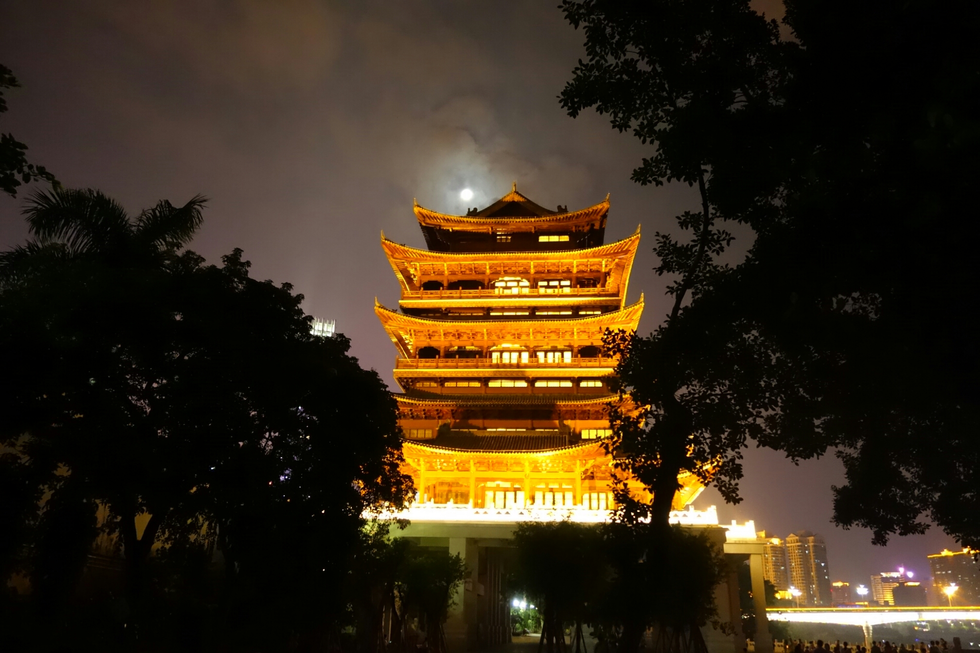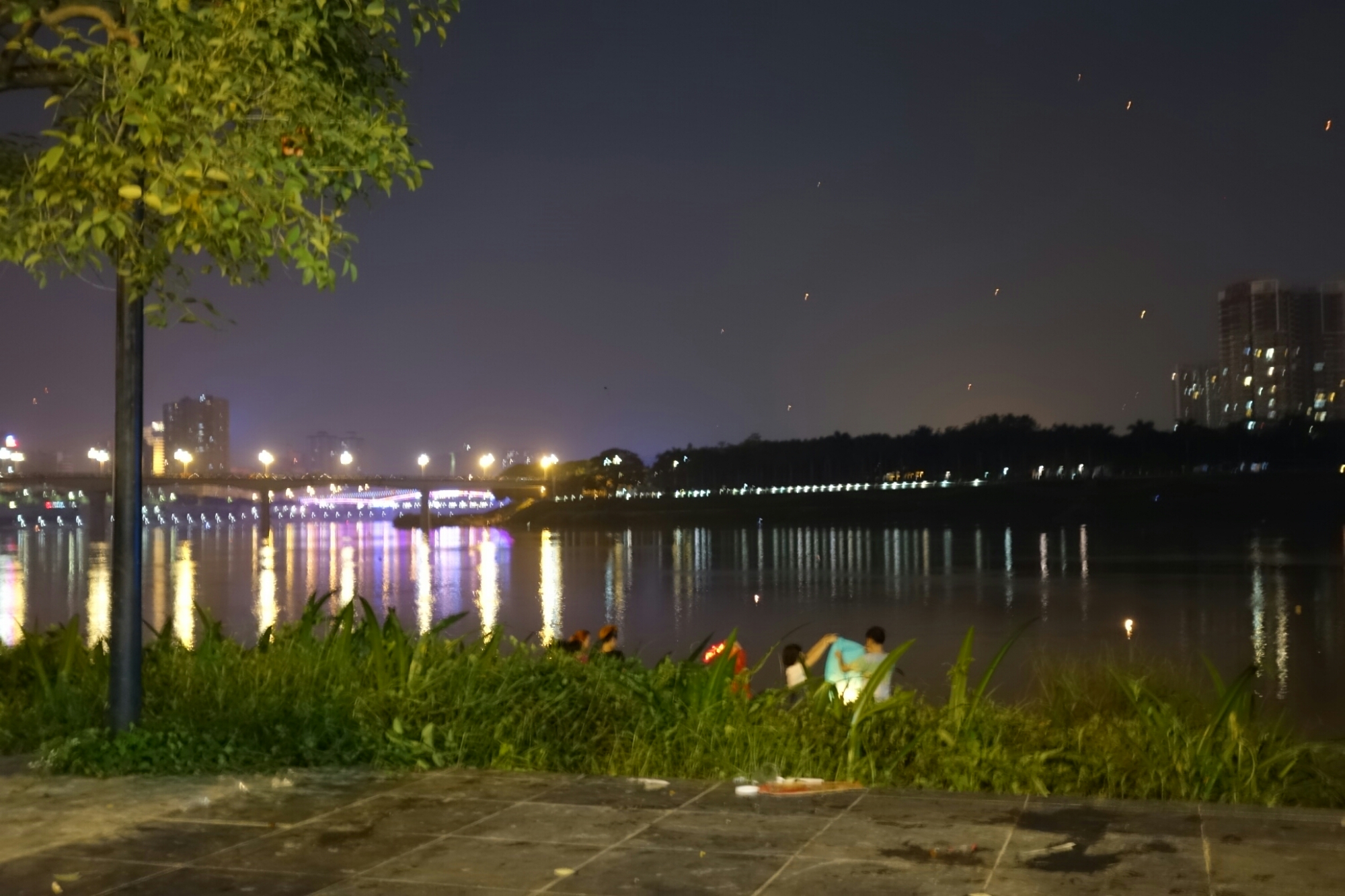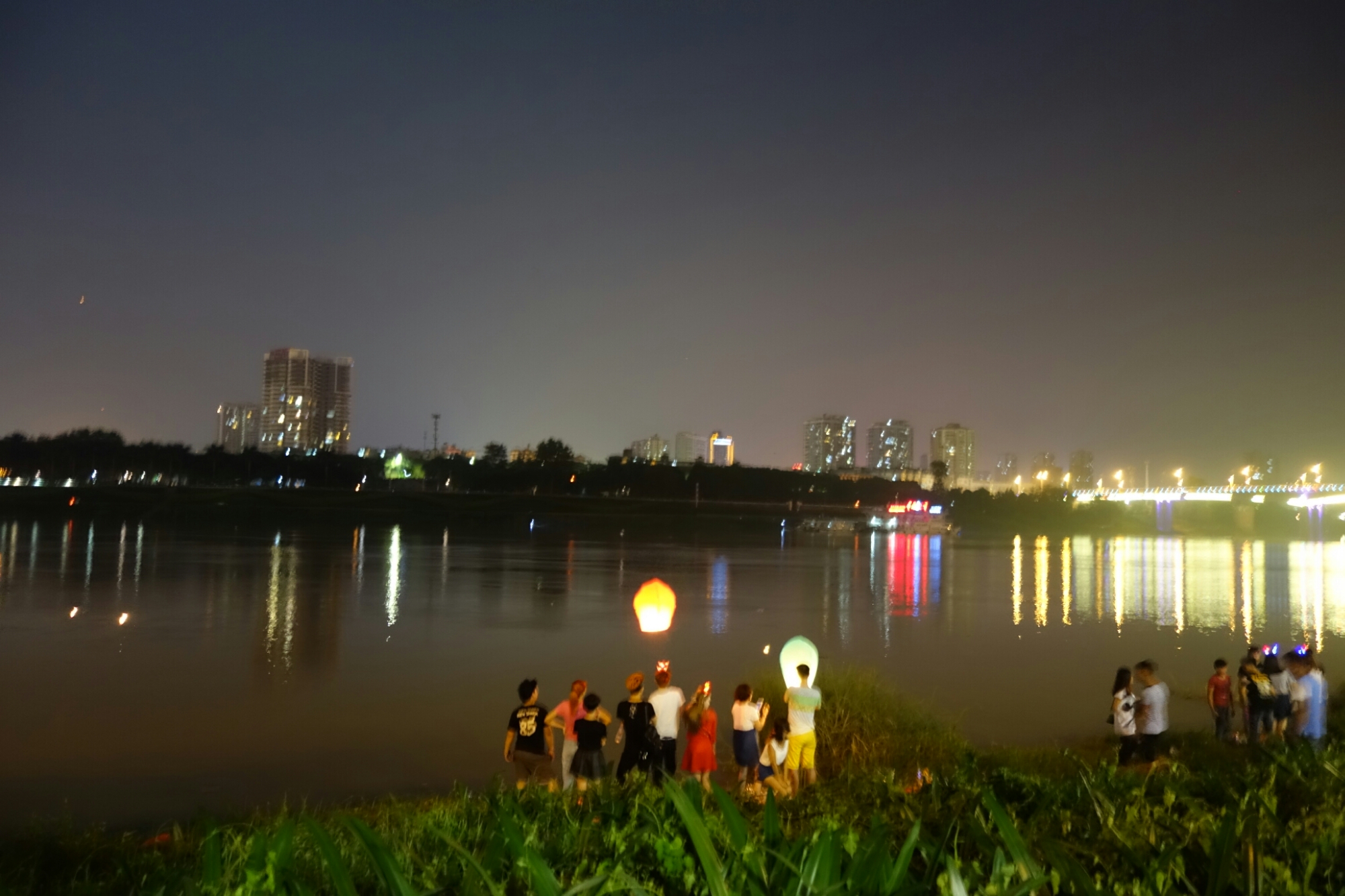Überall sind Menschen die in dieser warmen Nacht am Fluß entlang flanieren, es gibt an einigen Ecken Musik und am wolkenlosen Himmel sind neben dem wunderschönen Vollmond auch immer wieder Himmelslaternen zu sehen.