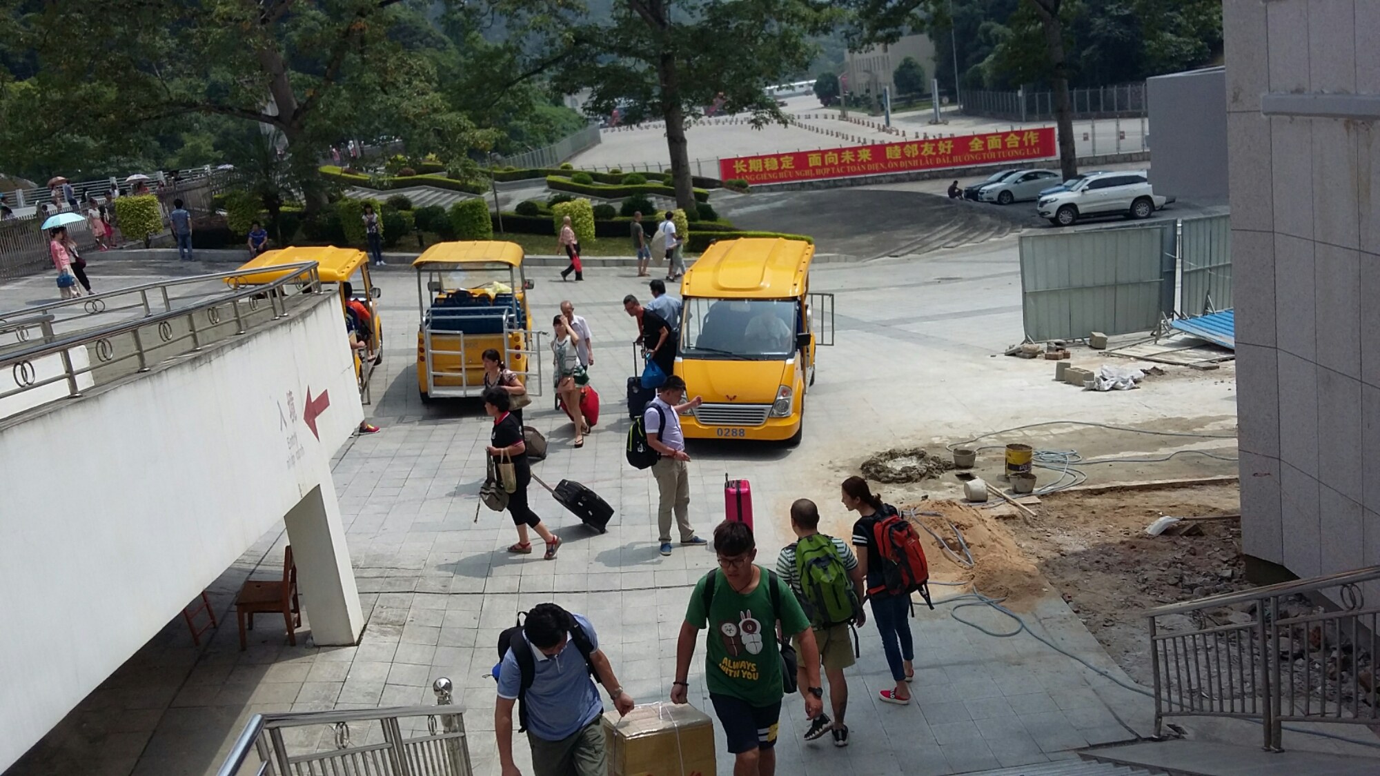 Passagiere und Gepäck werden in Golfwagen verfrachtet welche uns zus chinesischen Passkontrolle bringt.