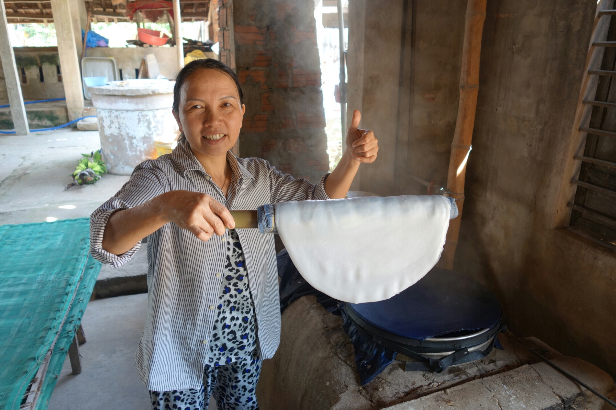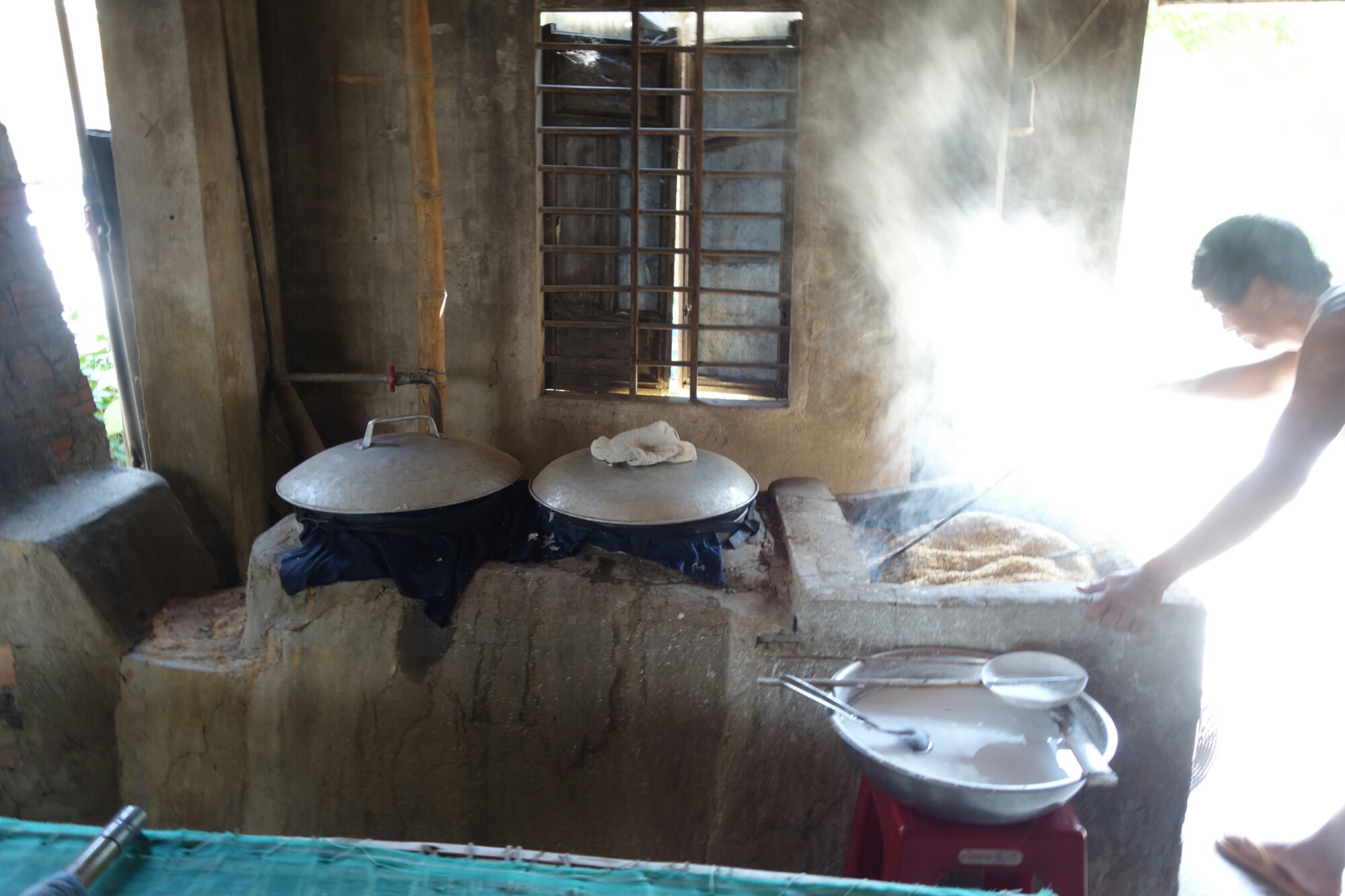 Eine Pampe die aus Reismehl und Wasser zusammen gerührt ist wird oben auf einem dünnen Stoff, der über einen dampfenden Kessel gespannt ist verteielt.