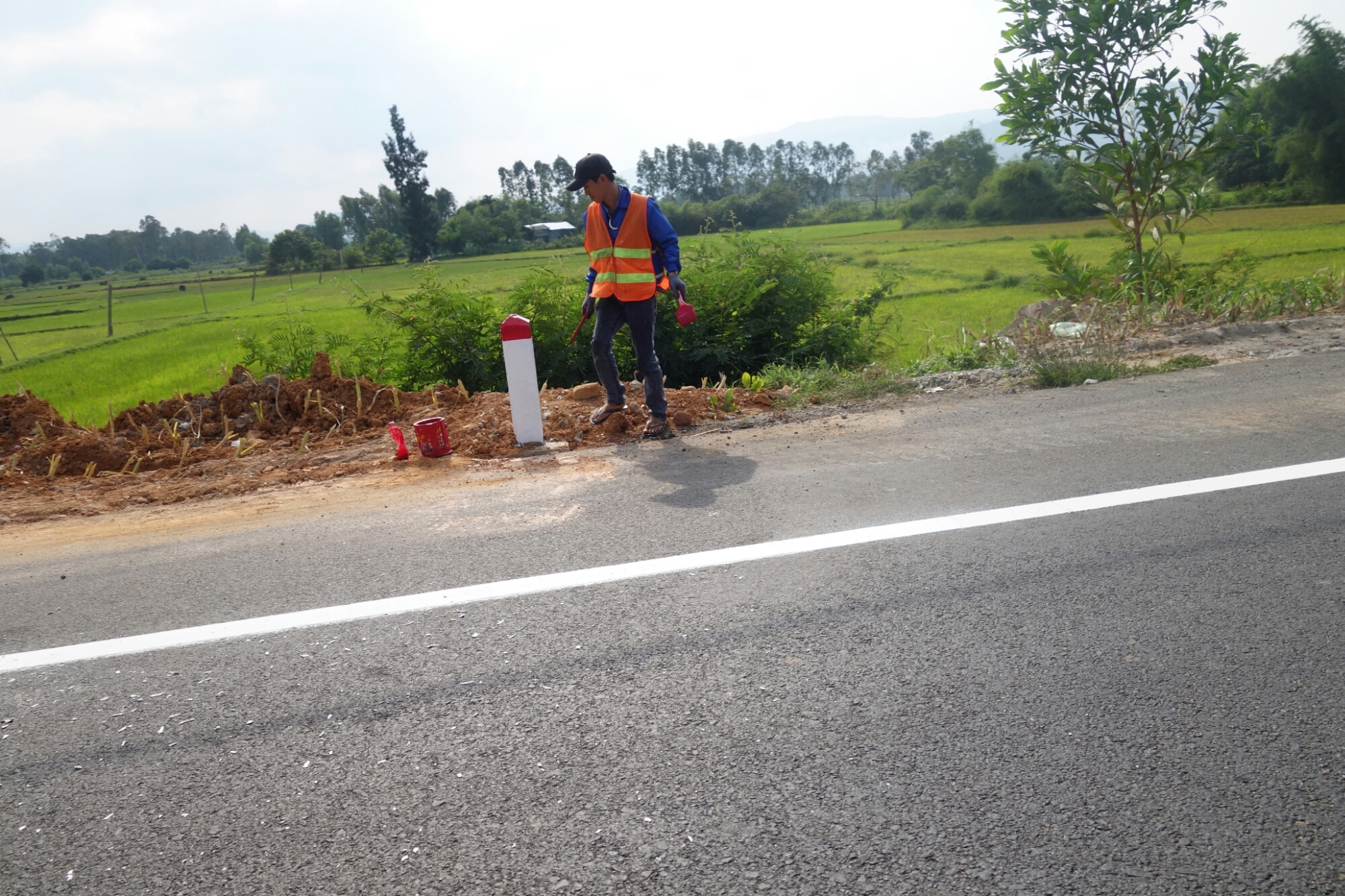 Einmal,als wir mal wieder nicht sicher sind ob die Richtung die wir eingeschlagen haben stimmt hält Binh an einer Baustelle und fragt einen Straßenarbeiter, der wie ich finde einen der spannendsten Jobs überhaupt hat, der gute Man pinselt die Spitzen der Begrenzungspfeiler rot an.😁