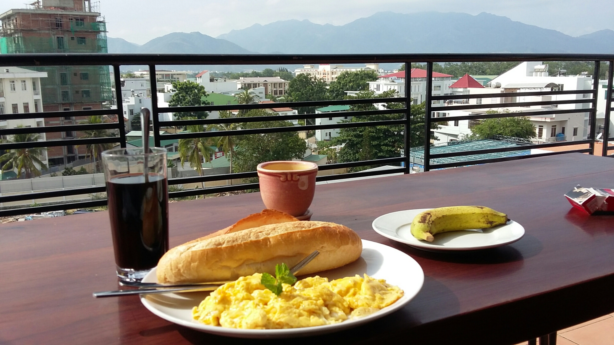 Nach dem ich meine Schmutzwäsche (langsam wurde es echt knapp und ich hab im Prinzip nichts sauberes mehr abzuziehen ) abgegeben hab geh ich nach oben auf die Dachterrasse um mir meinen verdienen Kaffee und ein kleines Frühstück zu gönnen.