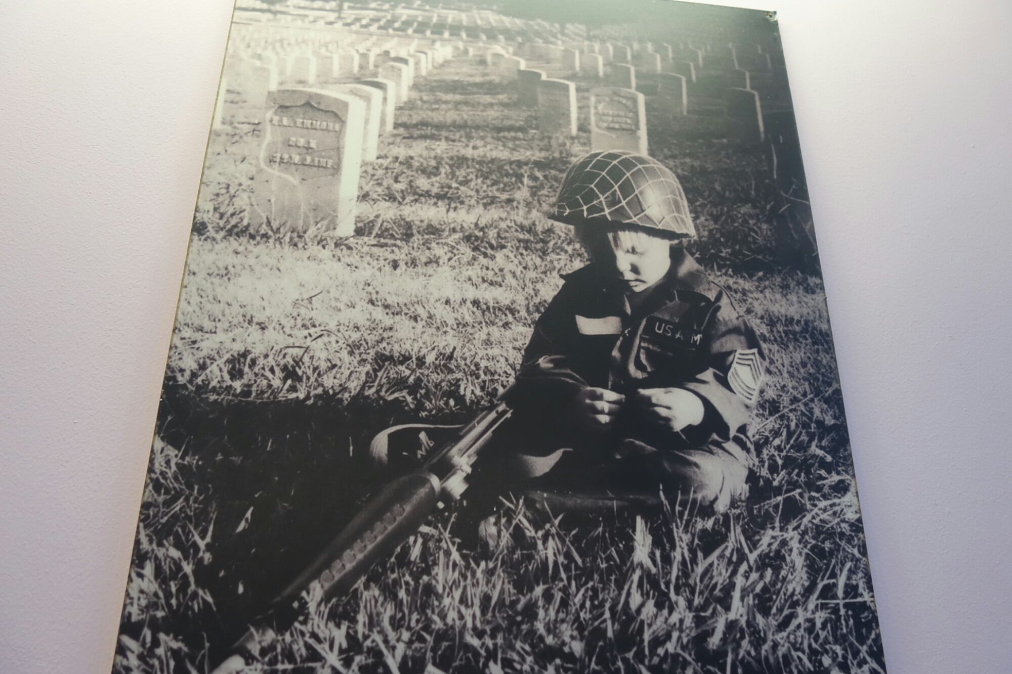 Er schaut sich auch die Bilder an aber ist fast mehr interessiert an den Bomben und Waffen, die hier ausgestellt sind.