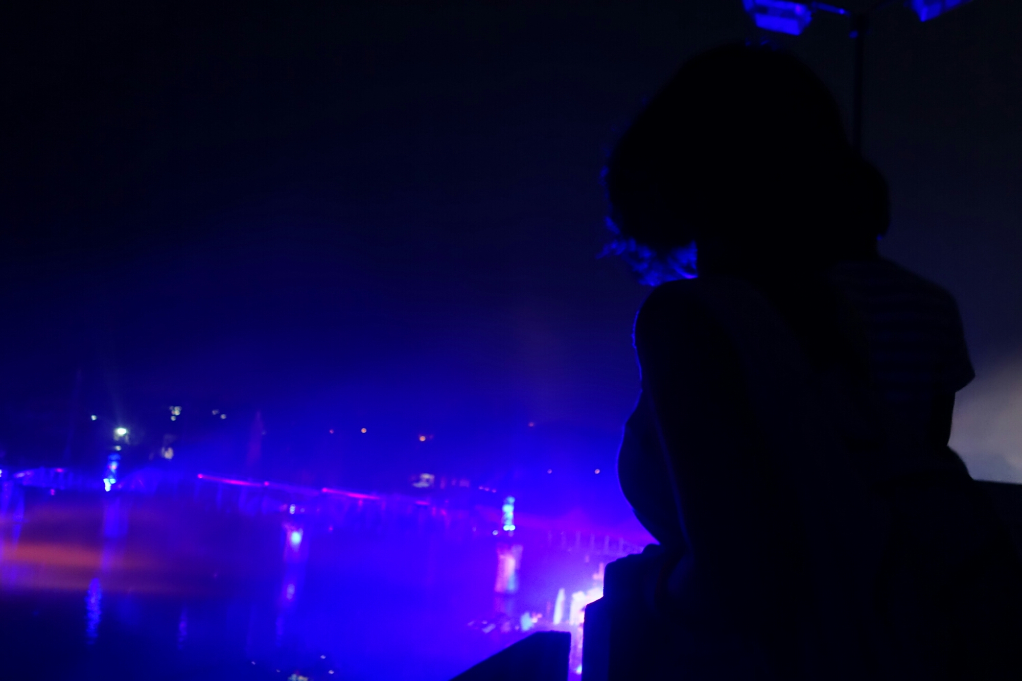 Wir werden im Dunkeln auf das Dach eines Hauses geführt von wo man eine klasse sich auf Fluß und Brücke hat.