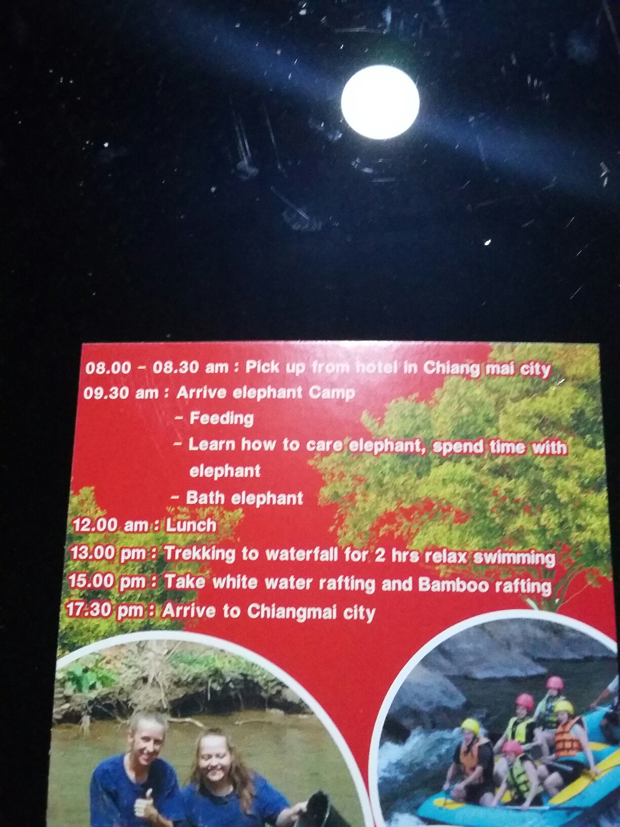 Ich finde ein im Vergleich zu den anderen relativ günstiges Angebot, für 1900 Baht ( etwa 47 Euro) eine Tagestour mit Wandern, Wasserfall, Bambusfloß fahren, Wildwasser Rafting und Elefanten baden.