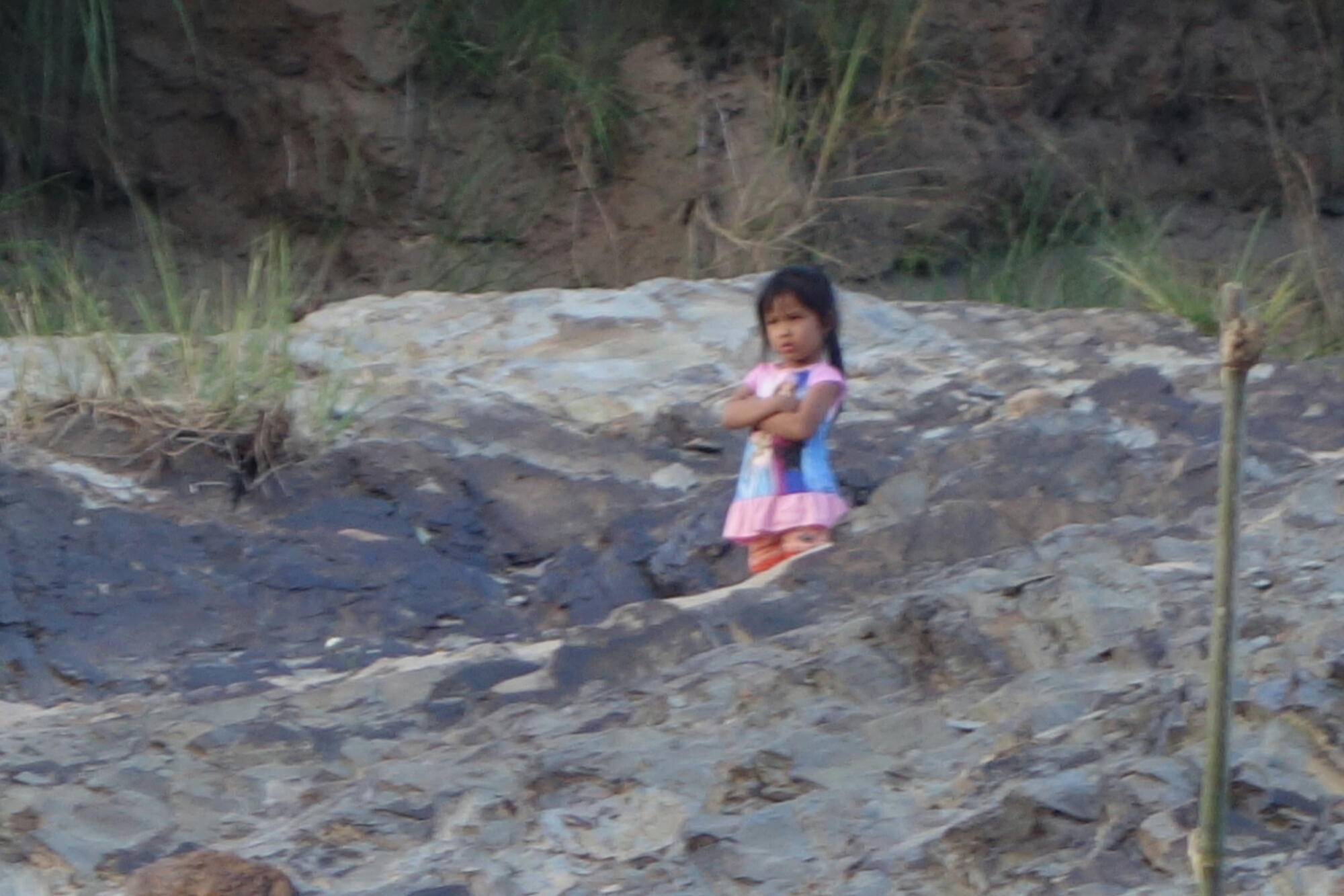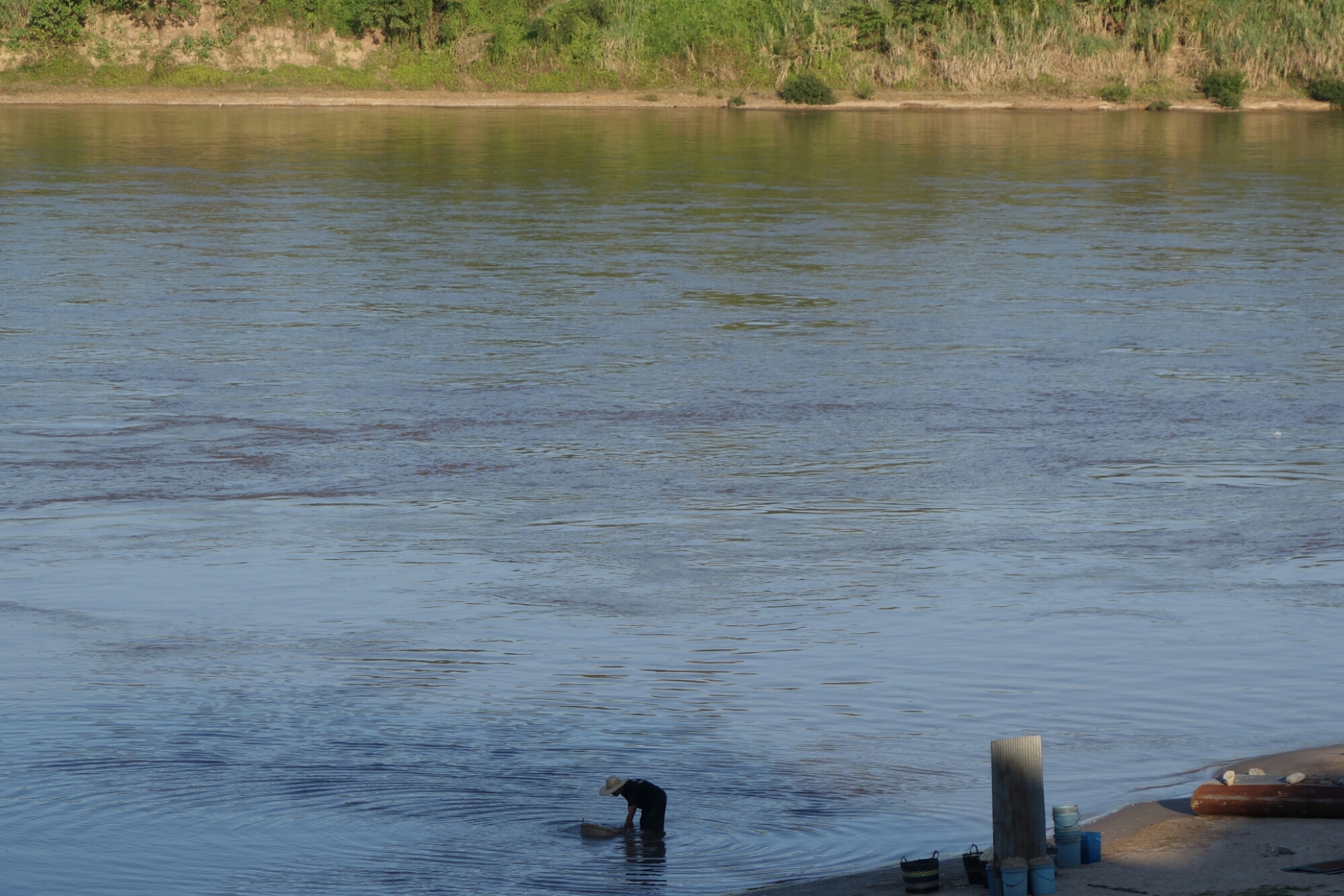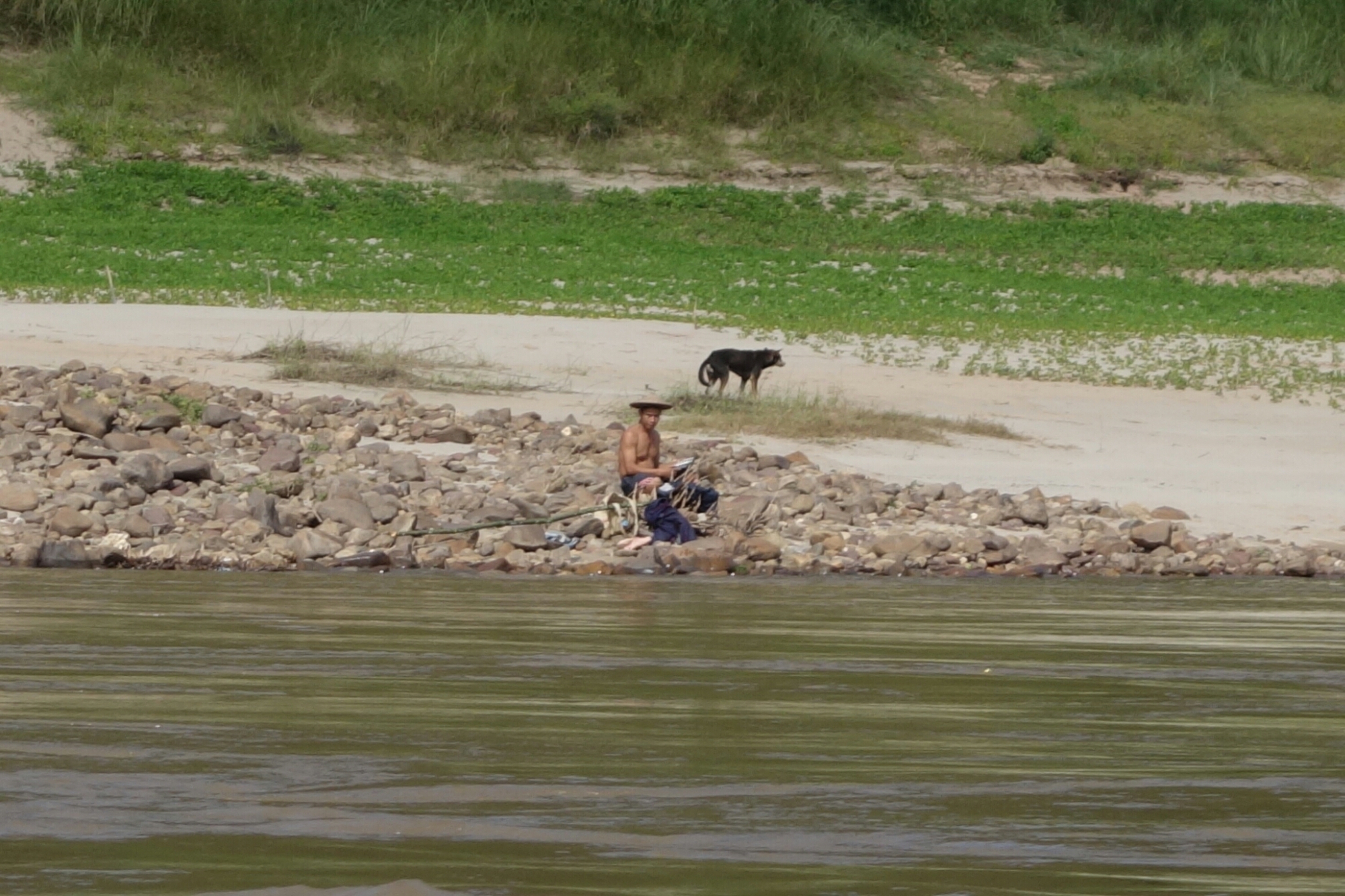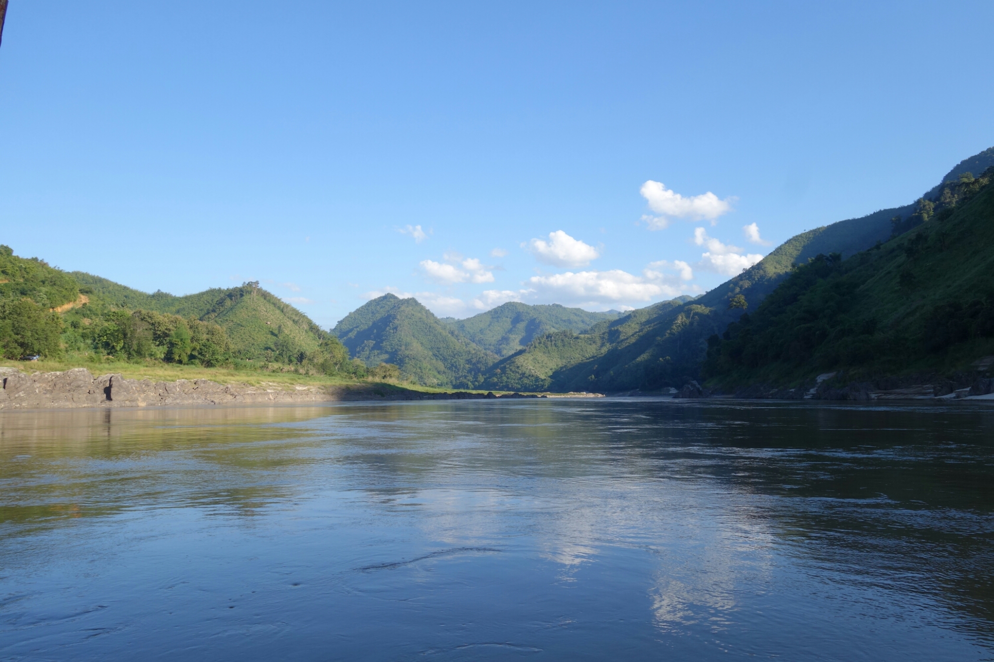 Die Fahrt ist auf jeden Fall gemütlich, rechts und links des Flusses sind Berge, Felsen und Dschungel zu sehen, gelegentlich treffen wir andere Boote oder sehen Fischer aber im großen und ganzen ist kaum Jemand am Ufer der Mekong zu sehen.