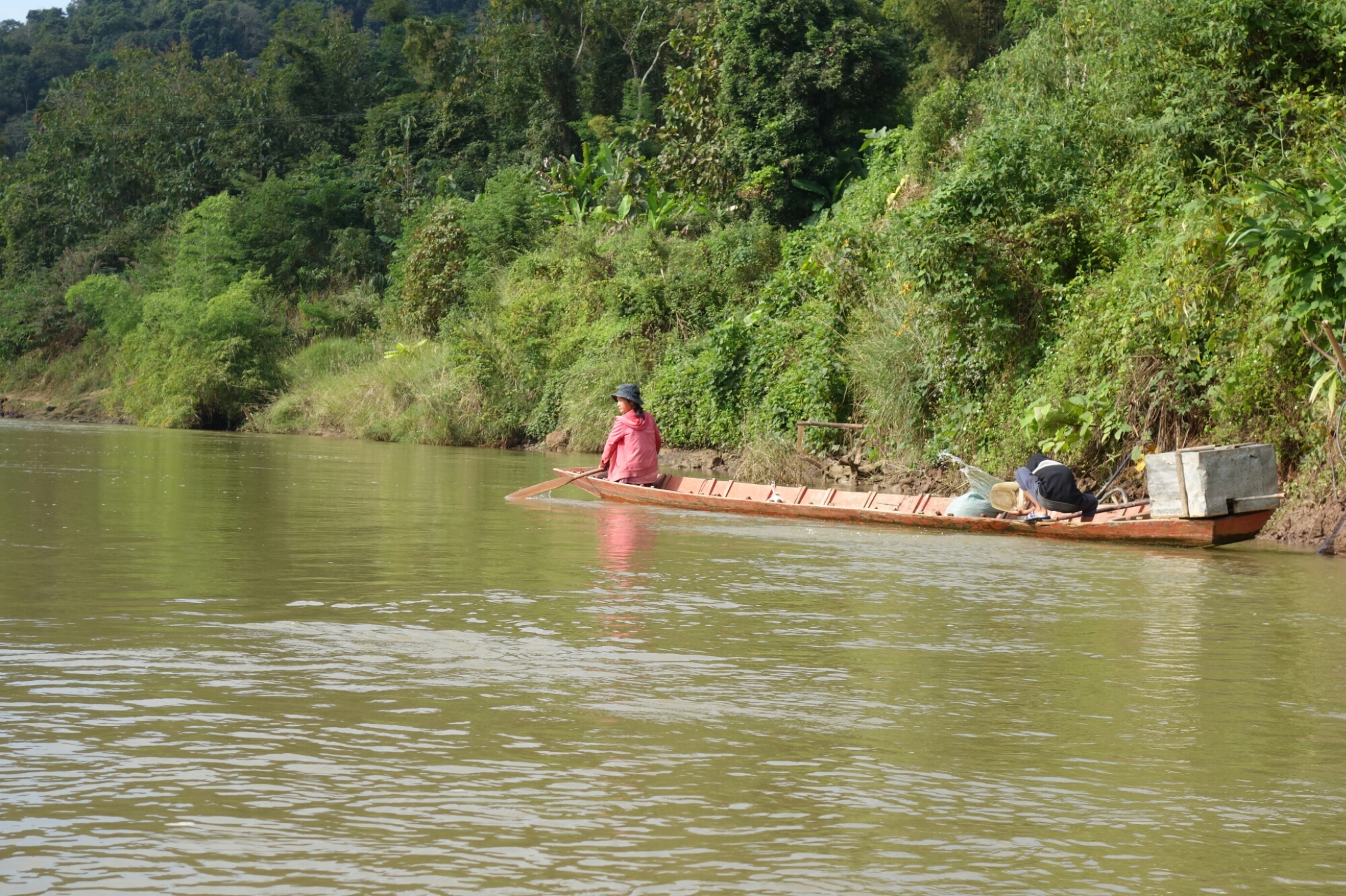 Natürlich haben unsere 2 Tourguides die passende Lösung parat und wir werden von einem Einheimischen mit seinem wackeligen kleinen Boot sicher ans andere Fluß Ufer gebracht.