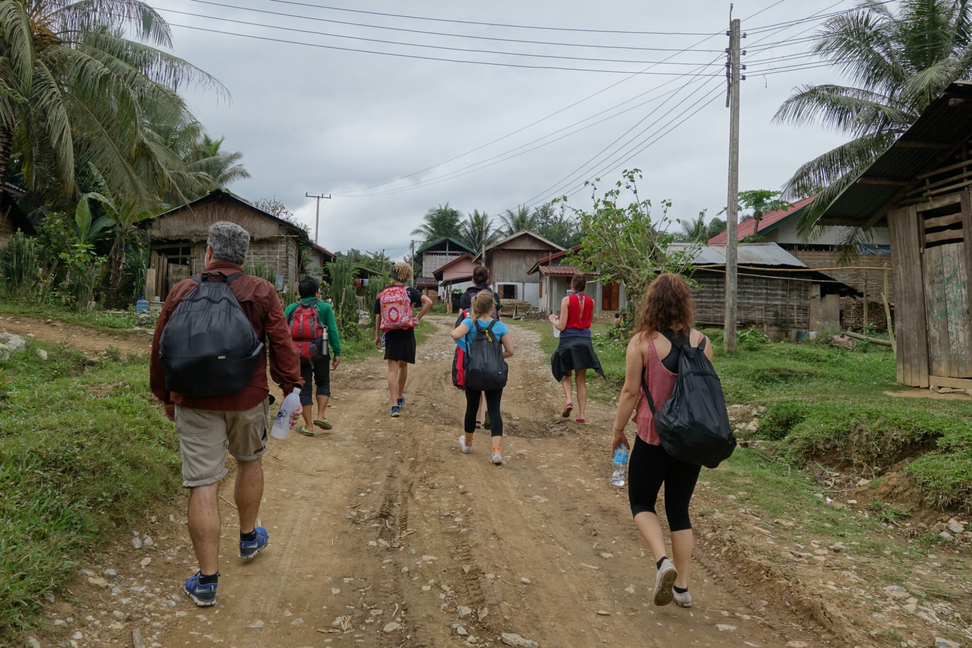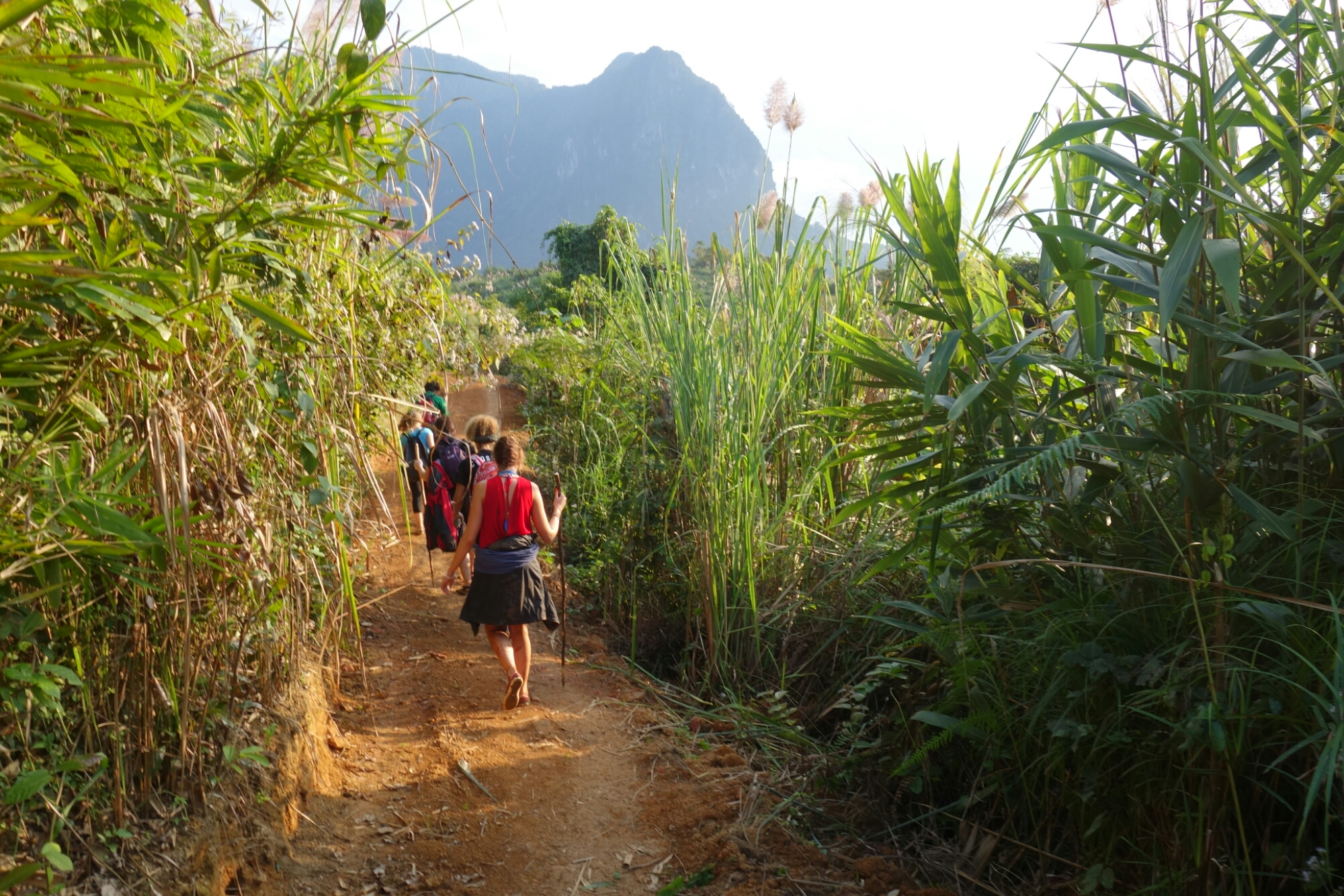 Jetzt geht die Wanderung richtig los, erst vorbei an Reis- und Gemüsefeldern, dann weiter durch den Dschungel bis wir nach etwa 2 Stunden das erste Dorf erreichen.