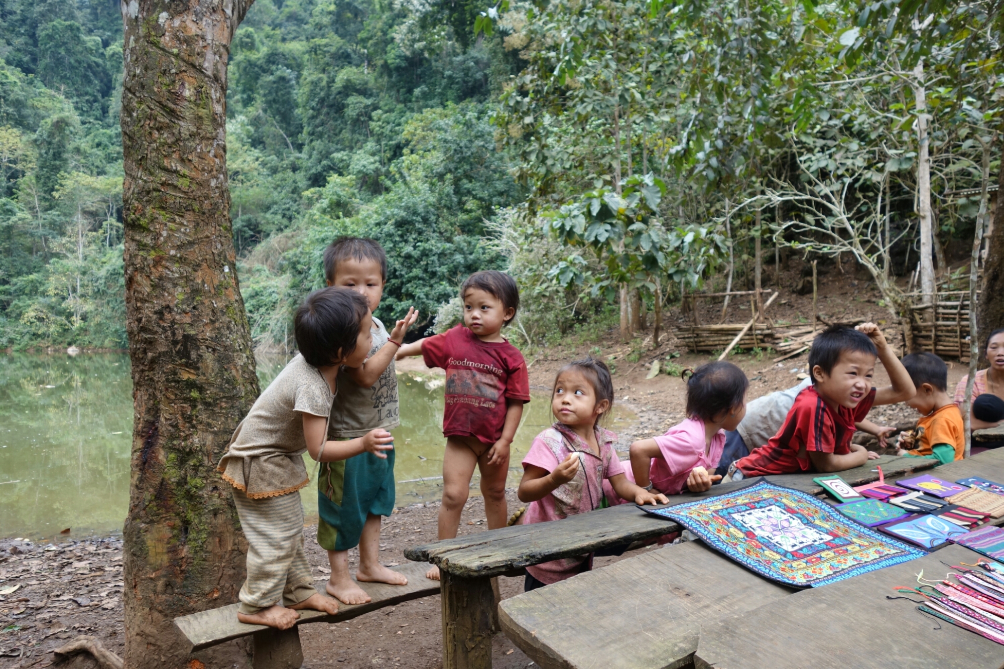 Ein paar Frauen haben Stände aufgebaut an denen sie selbsgemachte Taschen und Armbänder verkaufen und unsere Guide erklärt uns, daß die Familien so versuchen noch ein paar Kip zu verdienen und so auf jeden Fall das Geld hier den Einwohnern des Dorfes zu gute kommt.