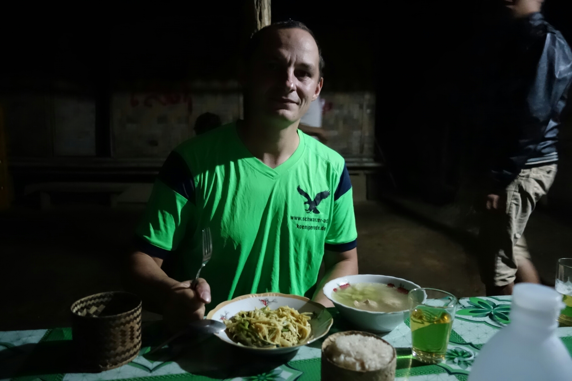 Die Mädels gehen schon recht früh ins Bett. Nur ich, der Amerikaner und unsere Guides bleiben etwas länger sitzen um ein wenig „Laos Whisky“ zu trinken.