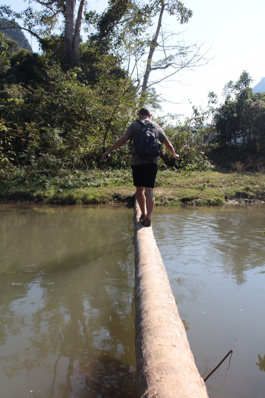 Jetzt steht für uns das nächste Dörfchen auf dem Programm wo es lang geht wissen wir, allerdings muss zu erst ein Fluß überquert werden und weil dieser an der Stelle an der unser Pfad auf ihn trifft verdammt tief ist und wir keine Lust haben eine flache Stelle zu suchen balancieren wir über einen für meinen Geschmack etwas zu schmalen Baumstamm.