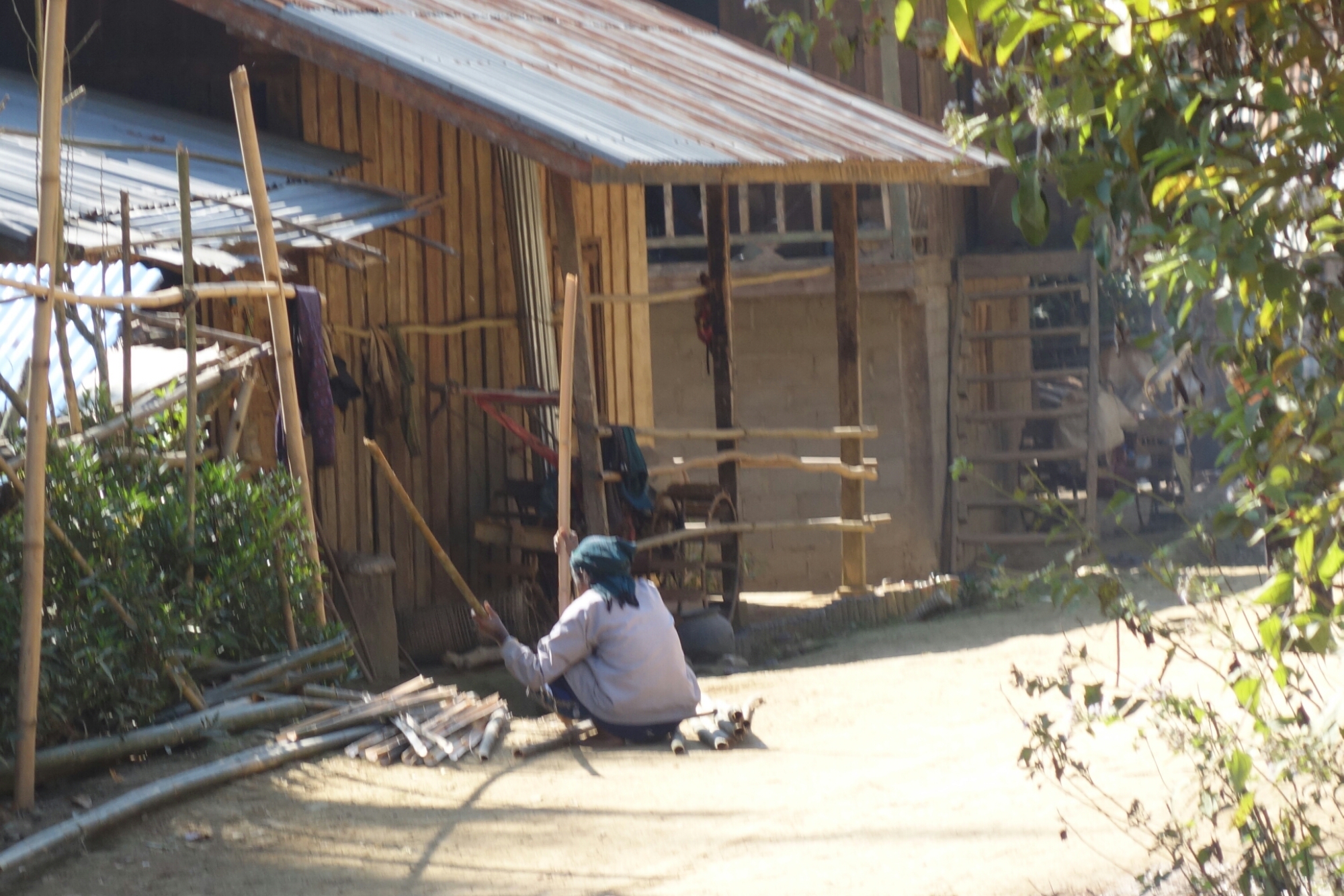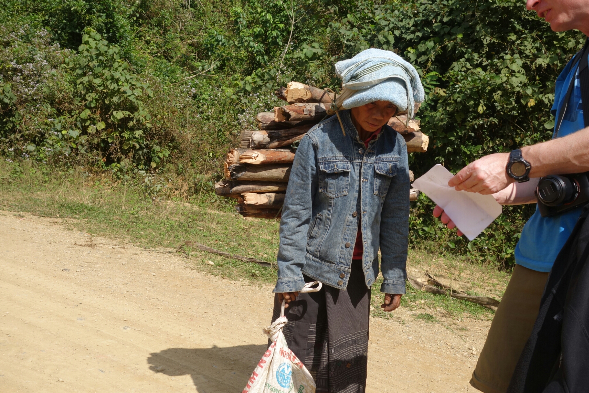 Wärend wir also noch alle 3 ziemlich doof auf dem Weg rum stehen kommt eine alte Frau mit einem großen Bündel voll Holz den Weg entlang.