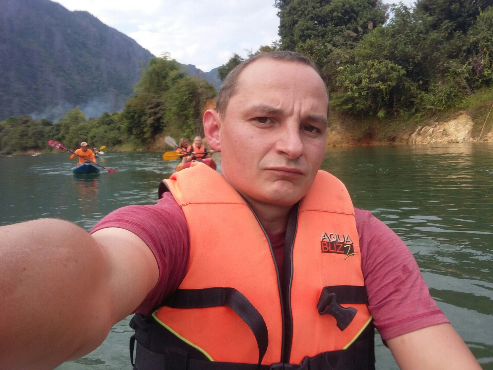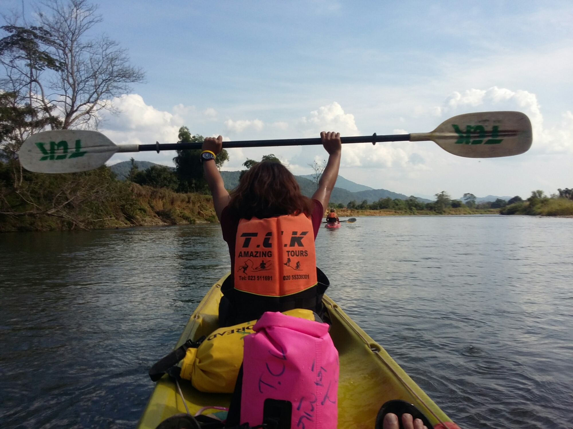 Der Nam Song ist im Prinzip ein recht ruhiger Fluß und dank strahlenden Sonnenschein haben wir beste Vorraussetzungen für eine gemütliche Kajak Tour.