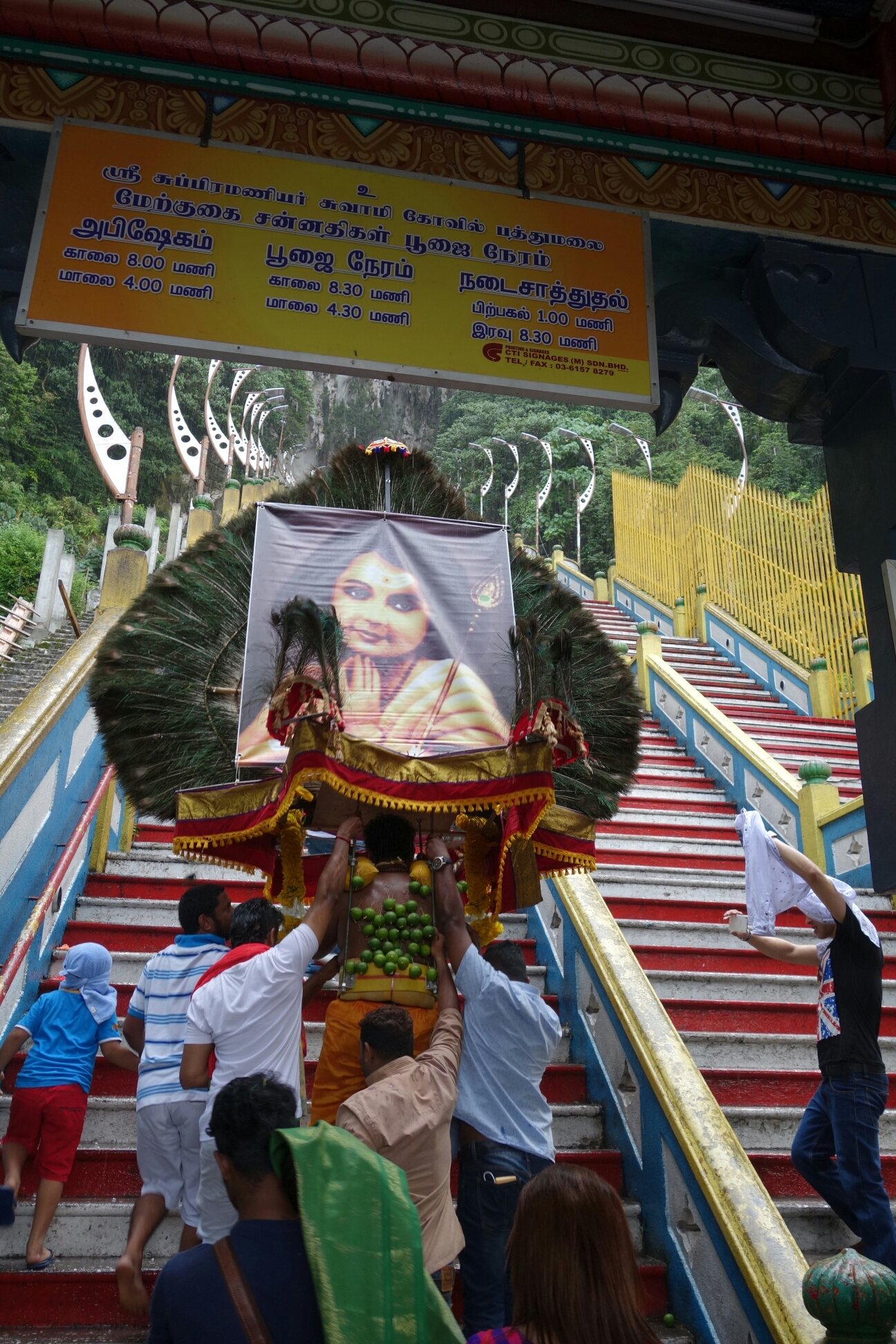 Am Fuß der riesigen Treppe, die rauf zur Haupthöhle  (Light Cave) führt ist besonders viel los und mitten in dem Gewimmel kann man einen Mann mit einem riesigen „Bild“ auf dem Kopf  (nach der Google Suche weiß ich ja jetzt das es sich um ein Kavadi handelt.)