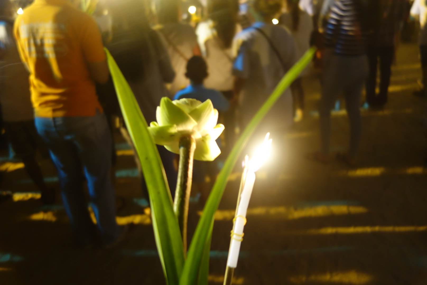 Tausende von Menschen mit Blumen, Kerzen und Räucherstäbchen laufen hier begleitet vom Gesang (oder ist es Gemurmel) von Mönchen um den Tempel.