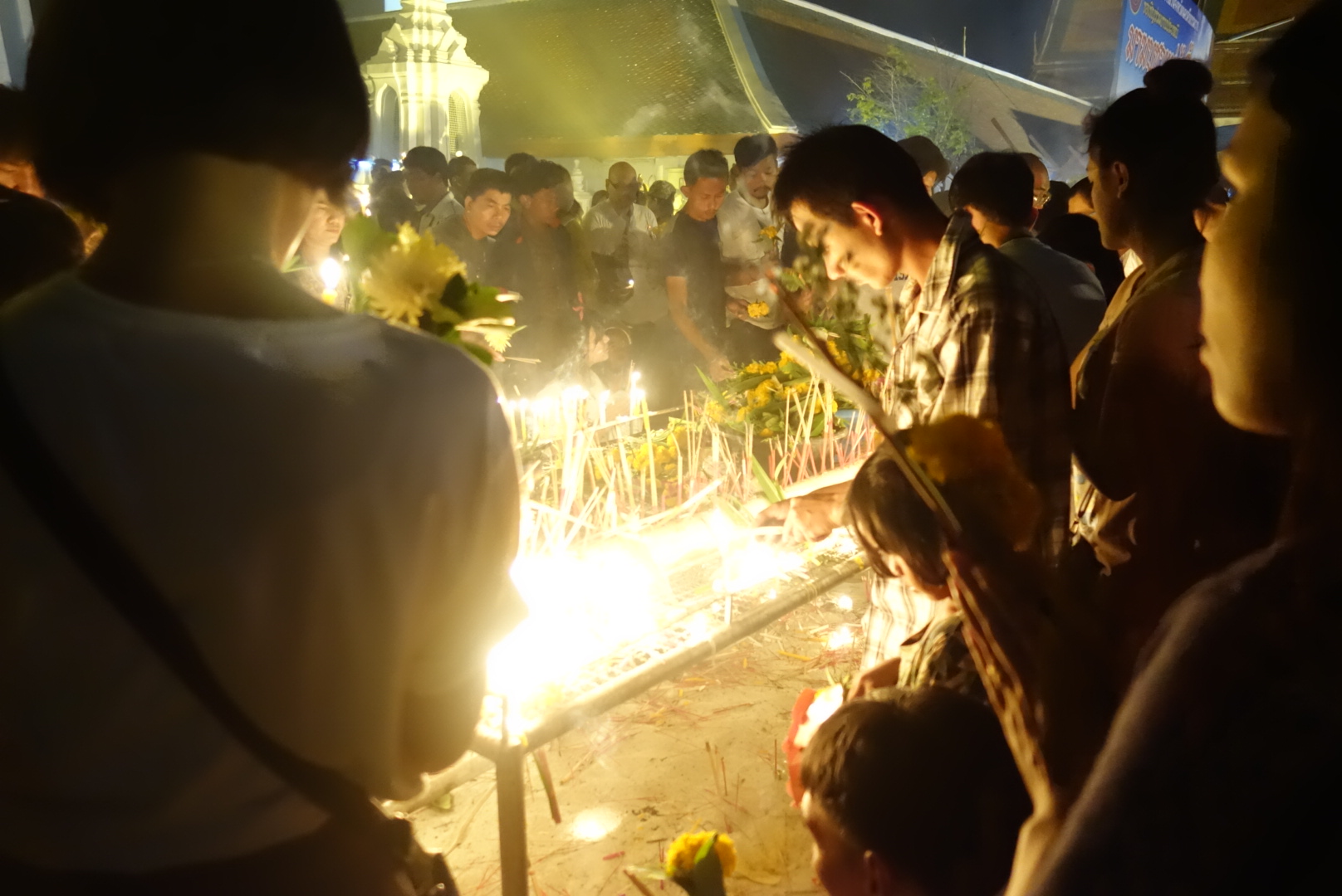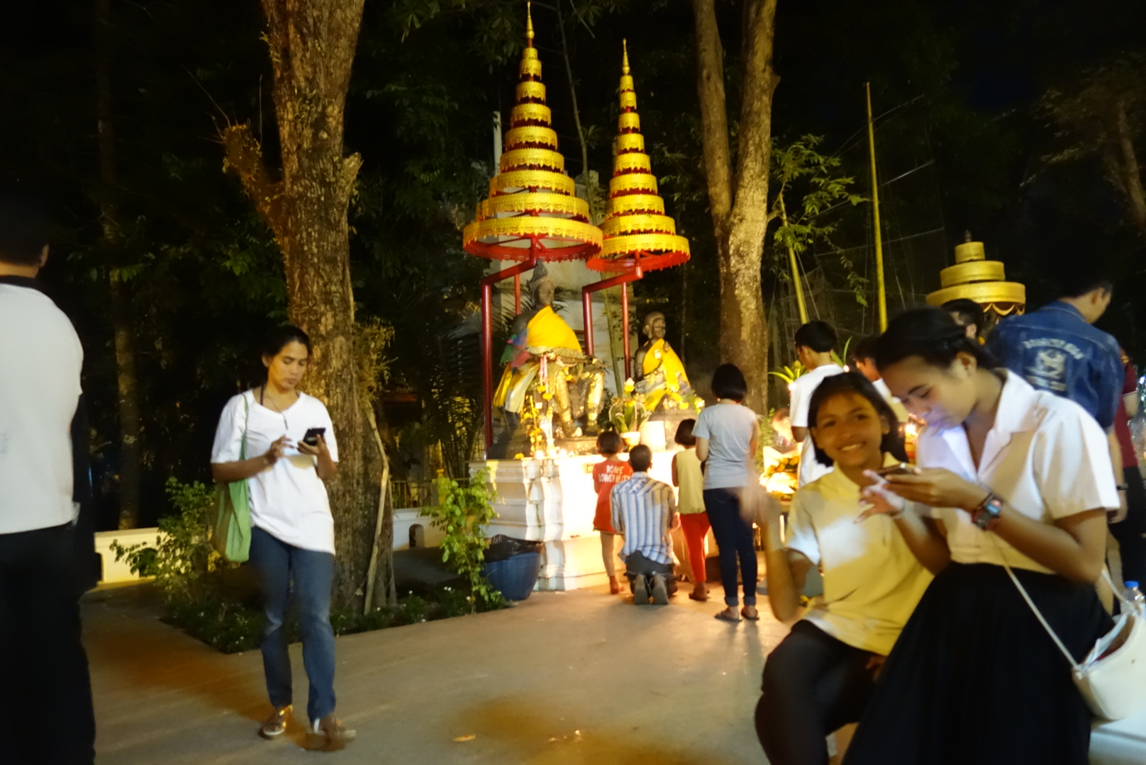 Ich mag die ganze Atmosphäre, die warme angenehme Nachtluft, der Geruch von Räucherstäbchen, das Singsang der Mönche und die vielen Menschen von denen ich als einziger Farang verstohlene Blicke und gelegentlich ein Lächeln ernte.