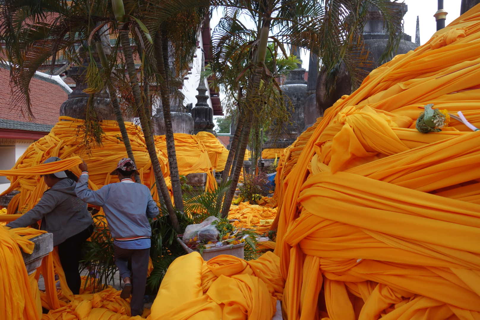 Was wir gestern nicht mit bekommen haben ist, daß die Pagodas hier in Kilometer lange Stoffbahnen eingewickelt wurden.