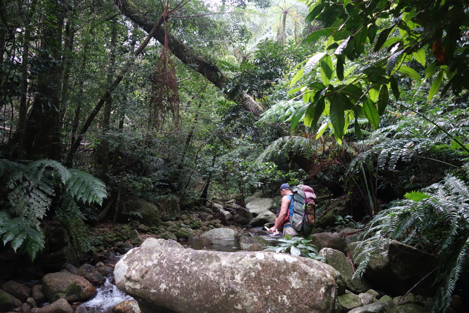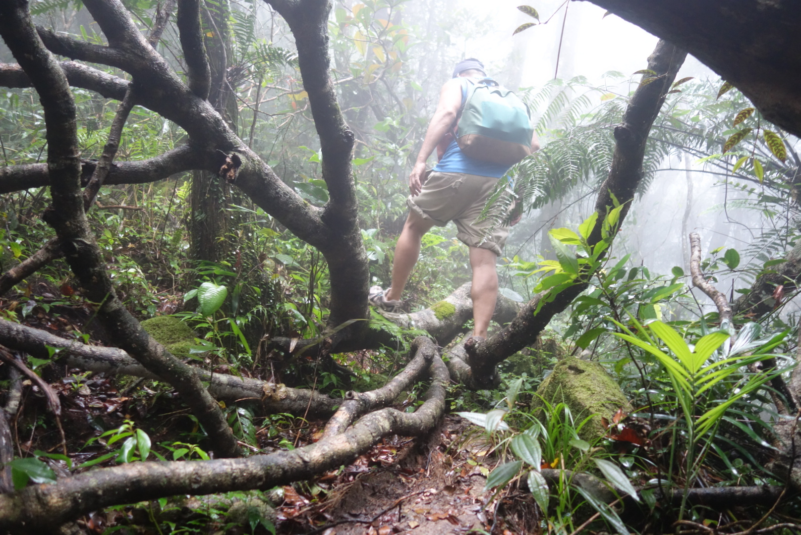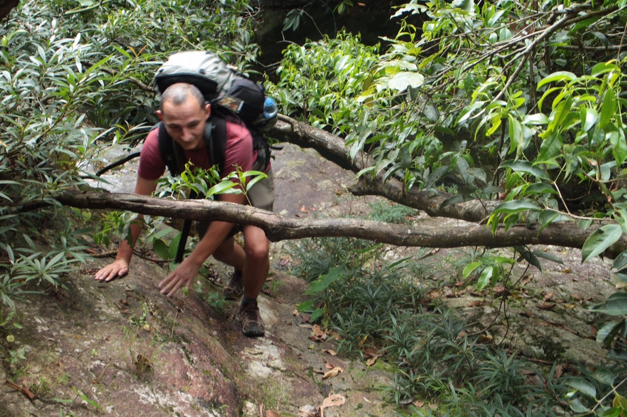 Wir klettern über Felsbrocken und um gefallene Bäume immer weiter bergauf.