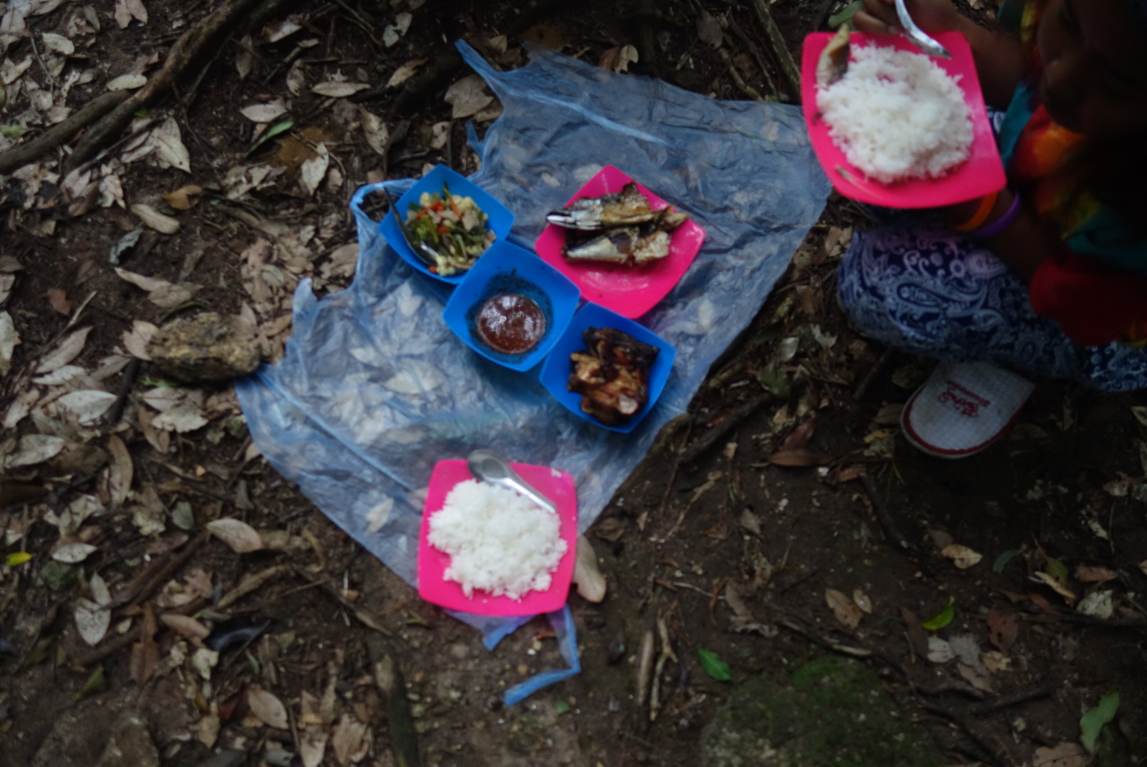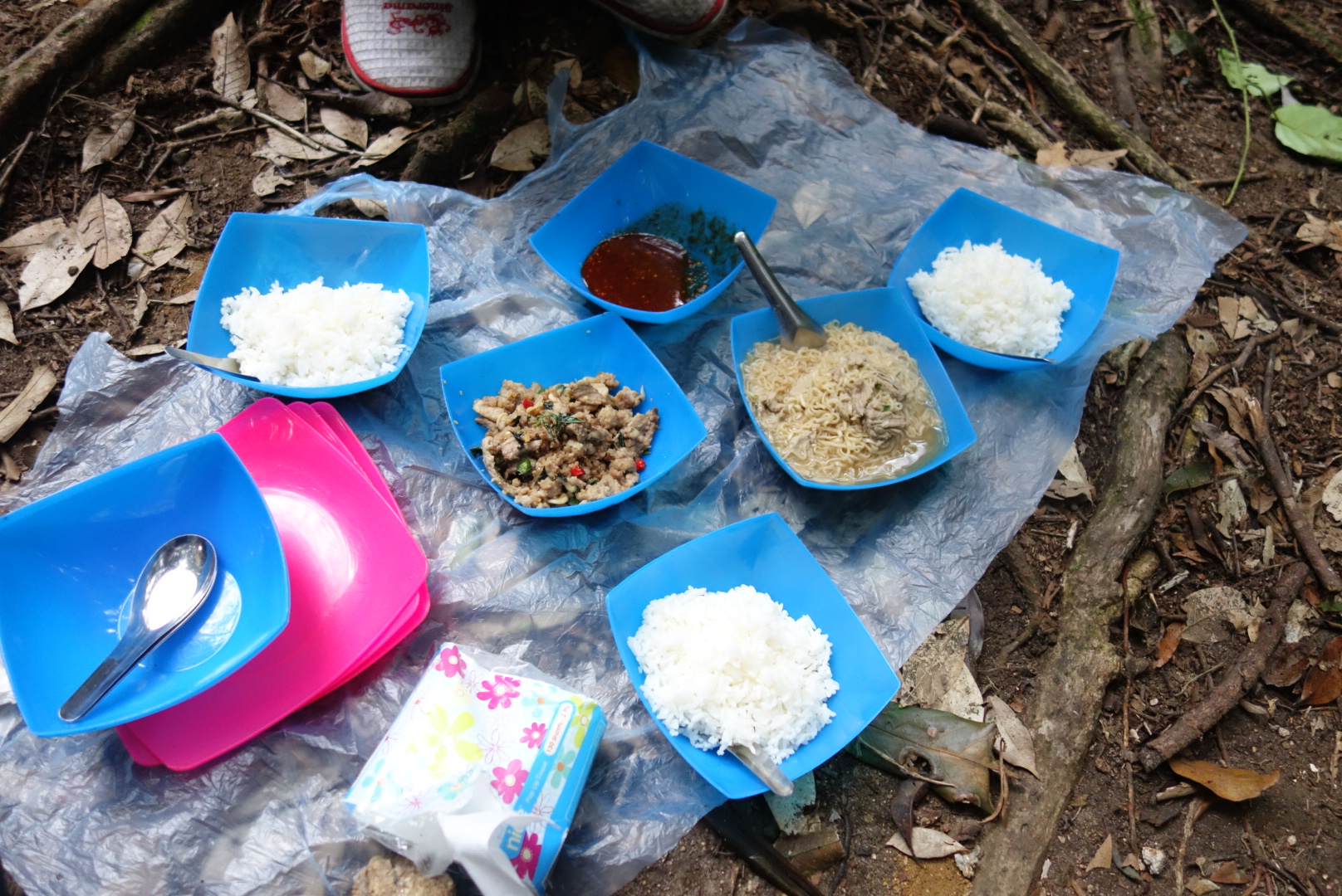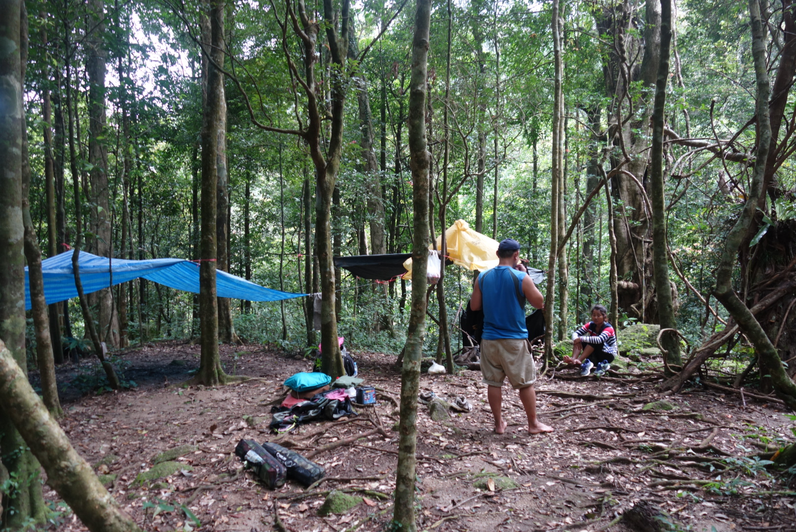 Das ist zwar jetzt blöd für Pikang, weil er das ganze Essen bis hier her geschleppt hat aber er willigt ein lieber weiter zu laufen und dann im “ Dschungel Camp“ wo es trockener, wärmer und windgeschützt ist etwas zu essen.
