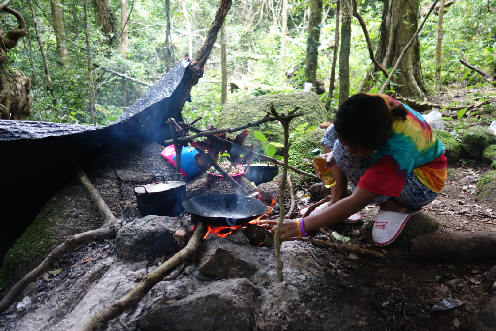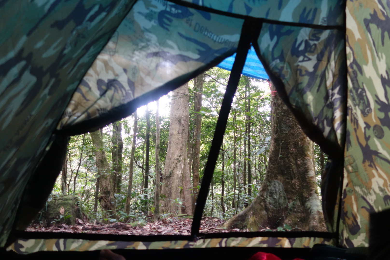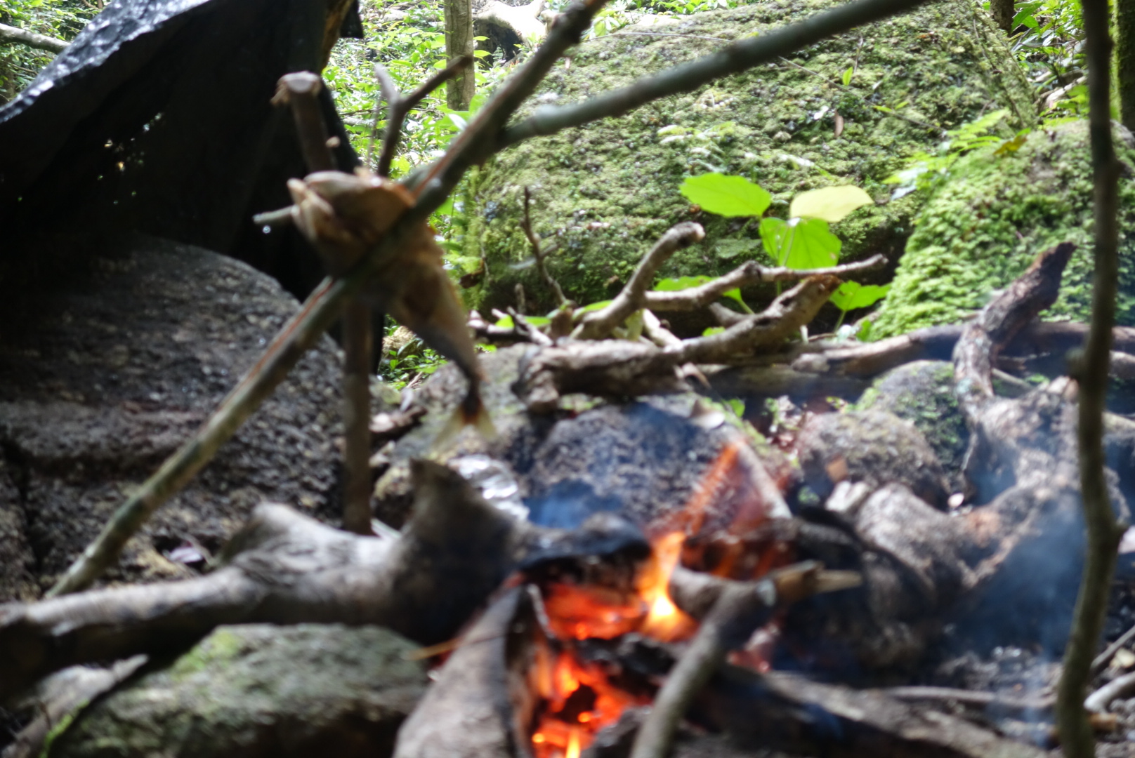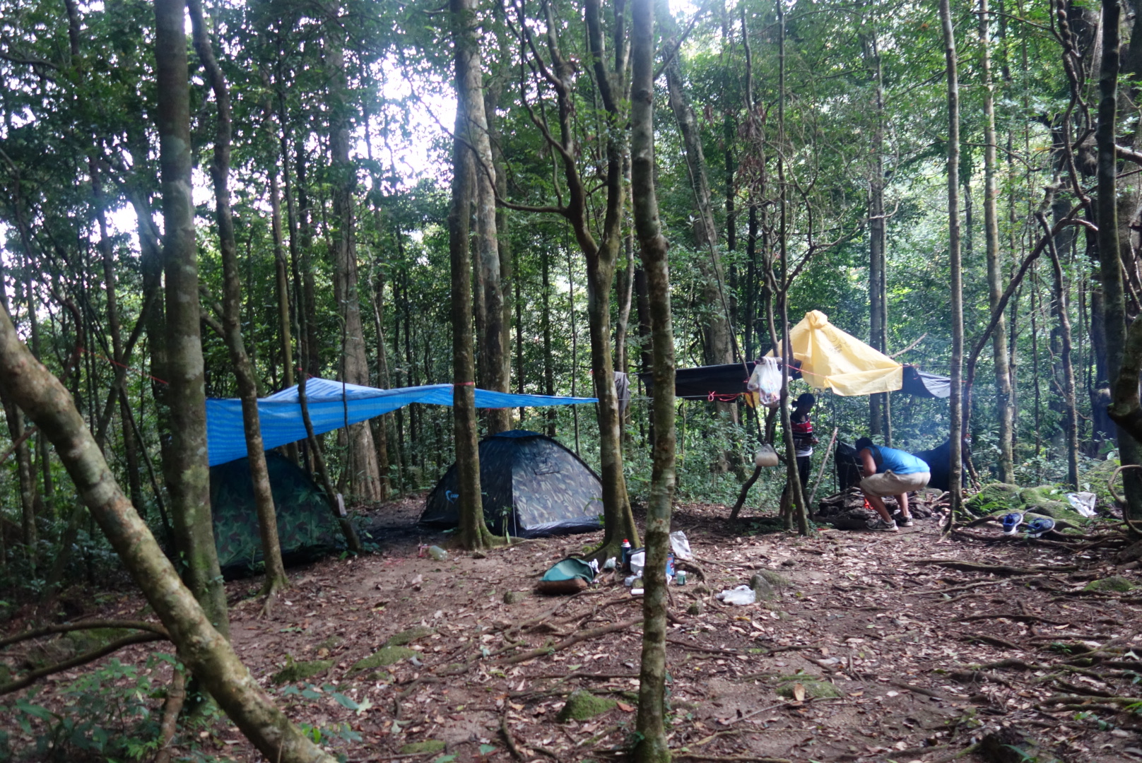 2 Stunden und (bei mir) 24 Blutegel – Entfernungen später erreichen wir einen Platz an dem eine Feuerstelle und gespannte Planen sind.
