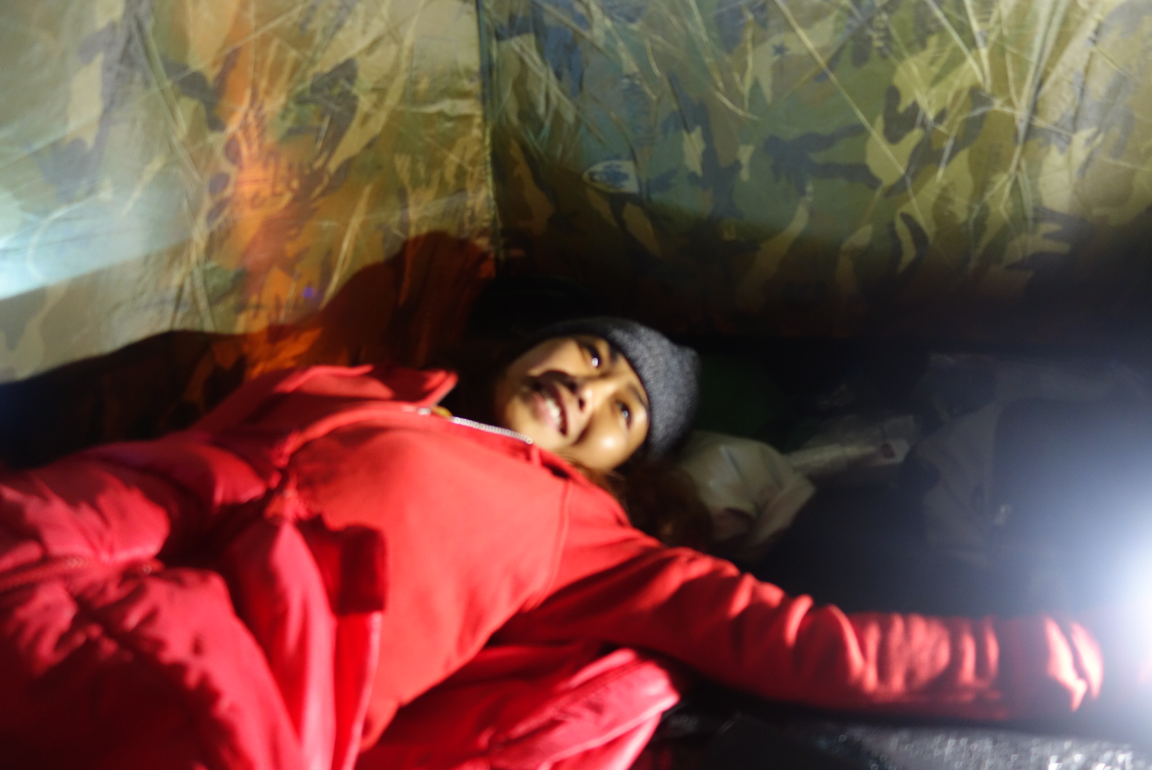 Ob ich wirklich schlafen kann weiß ich nicht, zum einen, weil wir nur Schlafsäcke aber keine Isomatten haben und der Boden nicht gerade bequem ist.