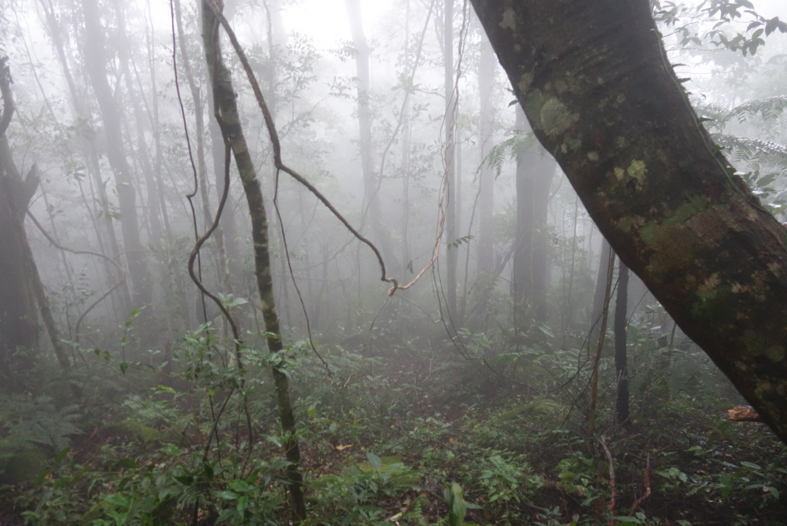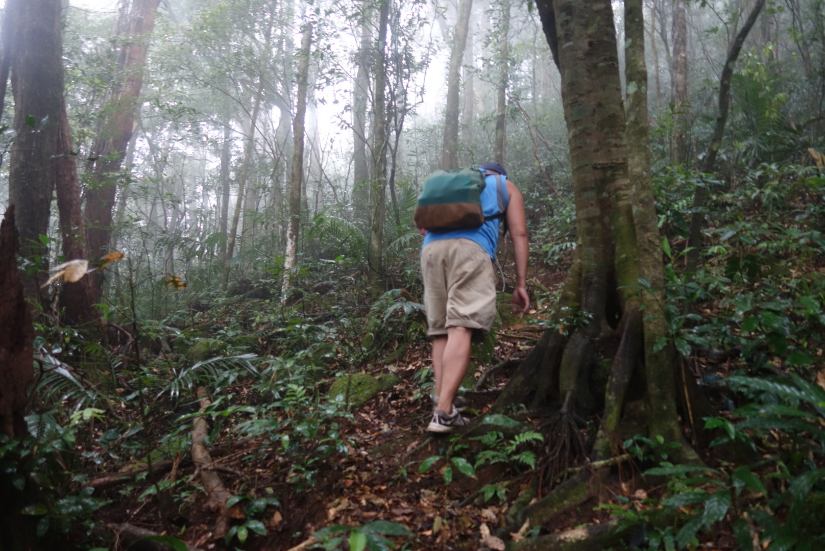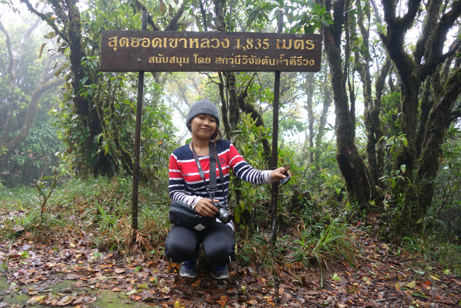 ตื่นเช้าขึ้นมาวันนี้พร้อมกับเสียงนกร้องสารพัด รู้สึกสดชื่นมาก รีบล้างหน้าแปรงฟัน แพททริคตื่นเป็นคนสุดท้ายตื่นมาพร้อมกับคราบเลือดไหลข้างฝ่ามือฝั่งนิ้วก้อย ซึ่งน่าจะแบ่งเลือดให้น้องทากเมื่อคืนจนอิ่มแปล่เพราะเหลือแต่คราบเต็มแต่เราพยายามหายังไงก็ไม่เจอว่ามันไปอิ่มแล้วไปหล่นอยู่ตรงไหน เนื่องจากเมื่อคืนแพททริคเดินเข้าออกบ่อยแต่ก็เช็คตลอดนะว่าหลงติดเข้ามาที่นอนหรือเปล่า ก็ไม่มี หรือไม่อาจจะมาจากตอนที่เราวางกระเป๋าลงพื้นตอนที่มาถึงจุดพักเต้นท์ หลอนเลยทีนี่ ส่วนฝั่งพี่คังตื่นมาทำข้าวต้มรอ ด้วยที่เค้าไม่ใช่พ่อครัวเป็นเพียงผู้นำทางเดินเข้าป่าเท่านั้น อาหารจึงไม่ได้เริ่ดหรูอะไร โดยปกติแล้วพี่คังเค้าจะมีทีมของเค้า พ่อครัว คนแบกของ และคนนำทาง แต่ด้วยที่เราต้องการประหยัด ขอลดค่าทัวร์เค้า พี่เค้าเลยตัดกองเสริมออกหมด เหลือแค่คนนำทางก็คือพี่คัง แต่เค้าต้องทำหน้าที่ทุกอย่างหมด คือแบกของเอง ทำอาหารเอง และนำทางเอง ข้าวต้มวันนี้คือข้าวต้มหมูใส่ไข่นกกระทา รสชาติจืดเพราะไม่ได้ใส่เกลือ เราจึงทำพริกน้ำปลาใส่ เราทานหมดชามแต่แพททริคเค้าทานนิดเดียวเพราะไม่คุ้นกับอาหารเช้ามากขนาดนี้ สรุปข้าวต้มเหลือเต็มหม้อพี่คังเก็บอุ่นไว้ในเตาและก็เตรียมกับข้าวตอนเที่ยงยัดใส่เป้ วันนี้เราจะพิชิตเขาหลวงกัน เตรียมทายาหม่องรอบนี้นิดเดียวพอกลัวจะร้อนแบบเมื่อวันแรกไม่ไหว พอเริ่มก้าวเท้าแรกเข้าสู่ป่าพี่คังก็จ้ำเอาจ้ำเอาไม่รอคนข้างหลังเลย รอบนี้เดินเร็วมากเพราะพี่เค้าไม่ต้องแบกของหนักมากเหมือนขาขึ้นวันแรก ส่วนเราเดินด้วยเช็คด้วยทุกวินาทีจึงทำให้ช้า ของเราไต่ขึ้นรองเท้านิดเดียวเราเห็นได้ง่ายๆเพราะรองเท้าของเรามันสีอ่อน ส่วนน้องทากจะสีน้ำตาลออกดำ ถ้าเห็นดำๆต้องสัณนิษฐานก่อนว่าคือน้องทาก ยิ่งเข้าลึกอากาศยิ่งชื่น หมอกลงหนักมากและมีน้ำค้างเปียกเต็มพื้นที่ ยิ่งชื้นหรือเปียกพี่คังบอกว่าตัวทากยิ่งชุม มันชูคอรอเกาะเราอยู่ข้างทางแล้ว เดินไปจนถึงจุดพักที่หนึ่ง เช็คความเรียบร้อยอย่าอนุญาติน้องทากเข้าพื้นที่ส่วนตัวเราเด็ดขาด อากาศดีมาก แต่อย่ามองลงที่พื้นเชียว ชูคออยู่เต็มพื้นที่ คือหาที่นั่งไม่ได้เลย พอเริ่มเดินอีกรอบทางเดินยิ่งชันขึ้นทุกที ทางเดินค่อนข้างลำบากนิดหน่อยปีนป่ายครบสเตป ยิ่งขึ้นไปสูงน้องทากก็เริ่มหายแล้ว จนถึงจุดพักที่สองเป็นจุดที่มีทัวร์อื่นเค้ามาก่อไฟทำกับข้าวกันตรงนี้ซึ่งบรรยากาศไม่น่าอยู่เลยตอนนี้มันชื่นมากถึงขั้นเปียกและอากาศค่อนข้างหนาว เราใช้