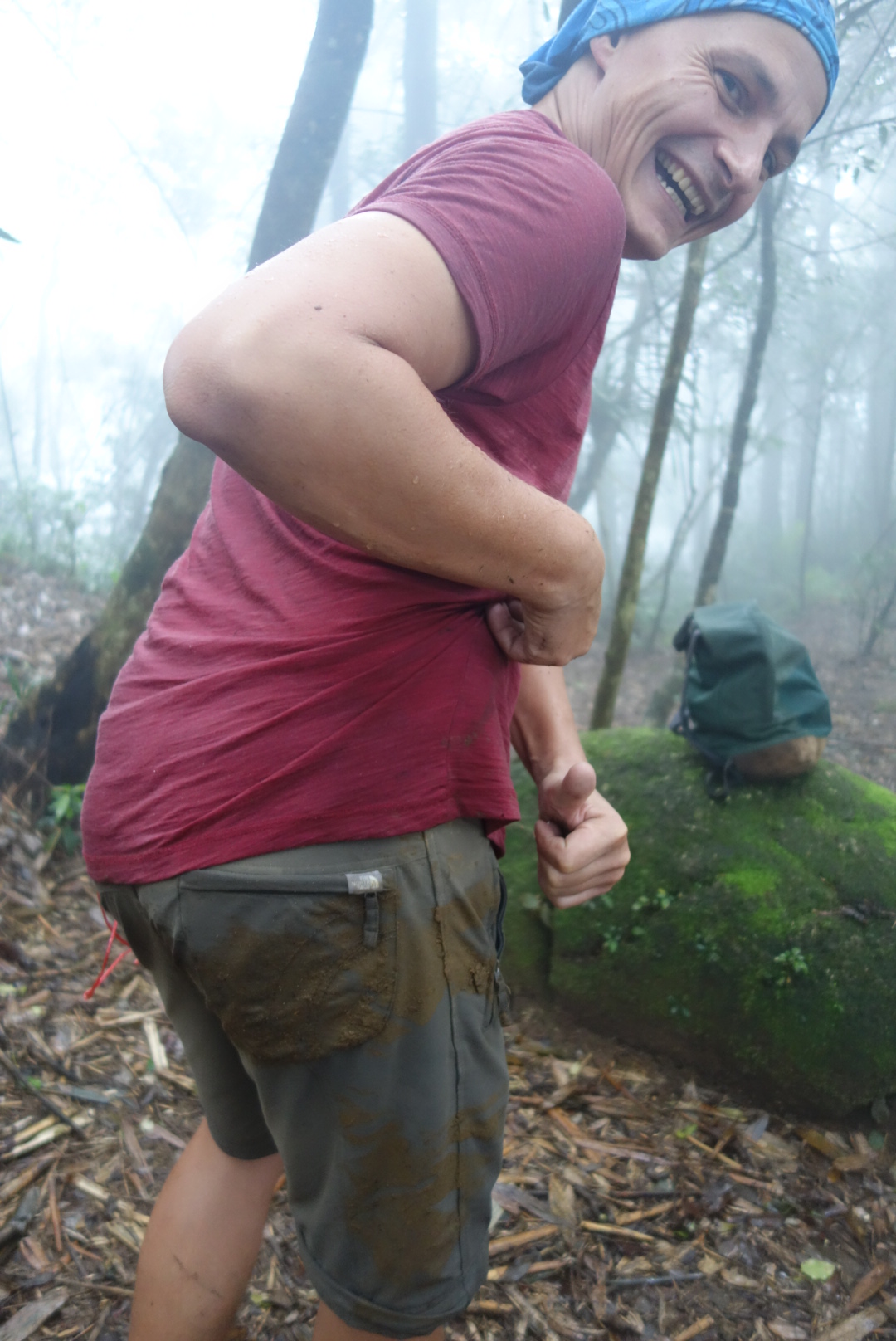 Kurz bevor wir unseren Rastplatz für die Mittagspause erreichen habe aber auch ich ein kleines Problemchen mit dem rutschigen Boden und lege mich der Länge nach hin.