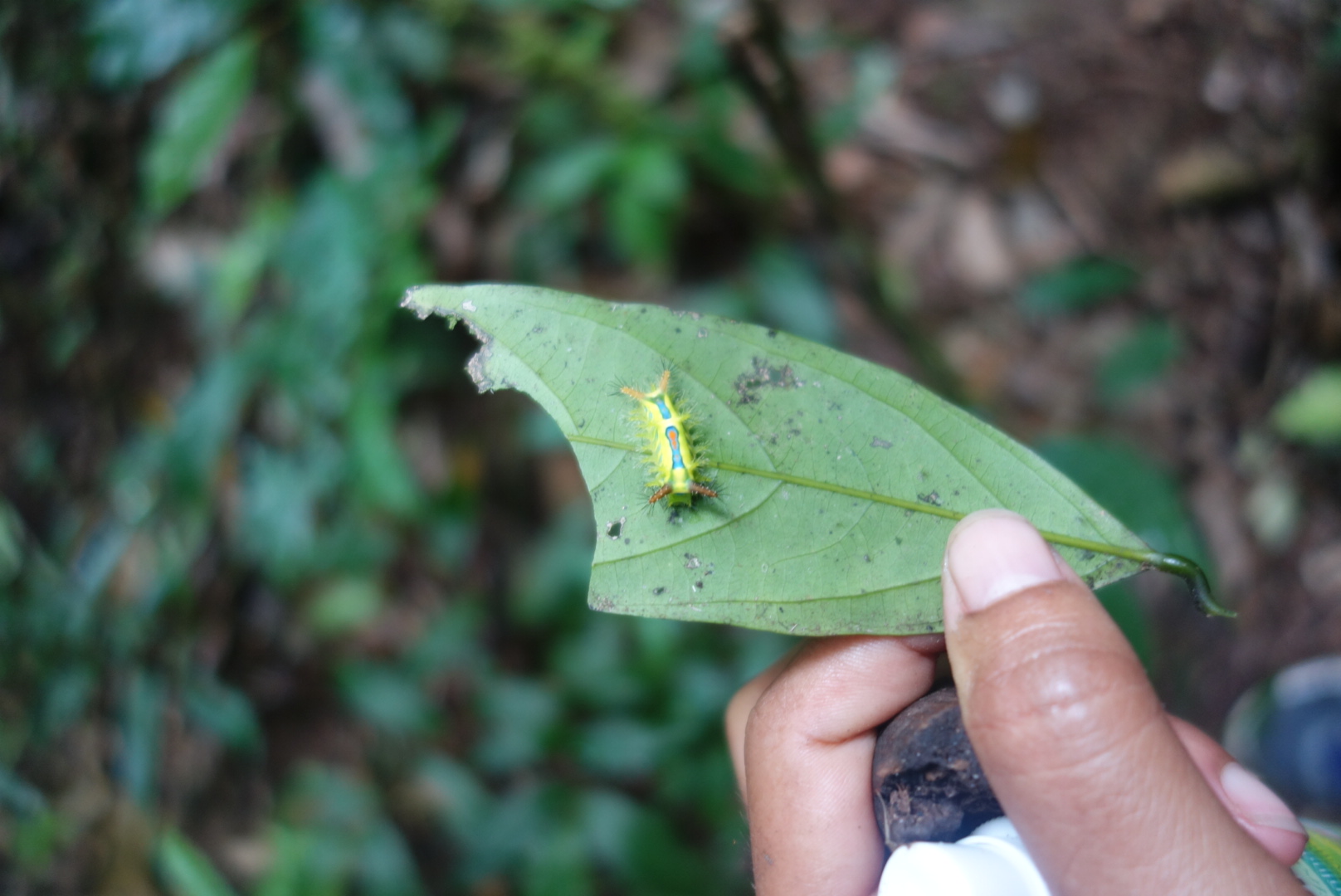 Übrigens sind auch die Raupen hier nicht ohne, Pikang fasst ausersehen in eine und hat gleich die ganze Hand voll kleiner Stachel.
