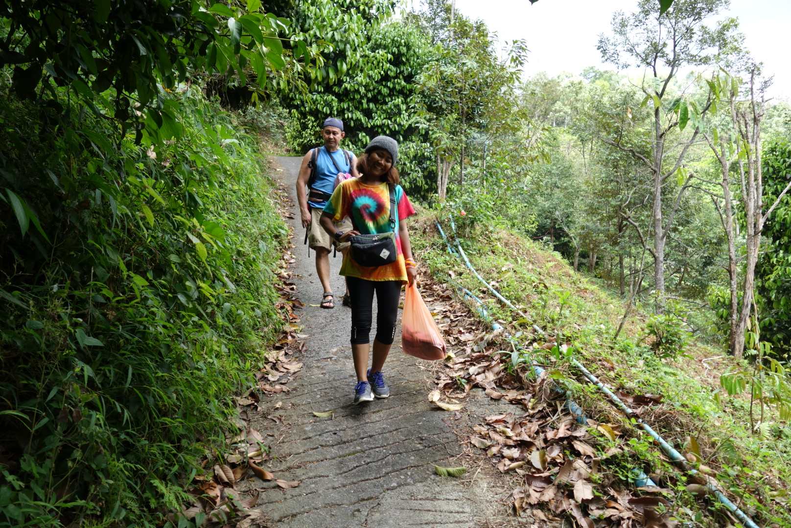 เช้าวันนี้เราเตรียมพร้อมตั้งแต่แปดโมงเช้าเพื่อลุยขึ้นเขาหลวงกัน ความสูงจากระดับน้ำทะเลที่ 1835 เมตร คือตอนนี้เรารออยู่นานสองนานไม่ได้ไปสักที เนื่องจากรถวิบากพี่คังพังต้องไปเปลี่ยนรถมอไซต์คันใหม่มาแต่ก็พังอีกจนต้องไปหายืมรถมอไซต์เวฟของเพื่อนมาใช้ก่อน ระหว่างที่รอพี่คังมารับนั้น พี่แหม่มก็เดินมาอัพเดทข้อมูลข่าวคราวให้ฟังเรื่อยๆ สุดท้ายพาพี่อารีย์เพื่อนบ้าน พี่อารีย์เป็นคนน่ารักนั่งฟังนั่งยิ้มตลอดเวลา พากันมาสกัดต่อมลุยเราไว้ ไม่ให้เราไปโดยพูดต่างๆนานาให้เรากลัวไอ้ตัวทากในป่า เราก็พยายามหาเสื้อผ้าหรือทุกวิธีที่ปกปิดมิดชิดไม่ให้เจ้าทากไต่เข้าไปกัดได้ เราเปลี่ยนชุดออกไปโดยใส่แลกกิ้งสีดำและเสื้อแขนยาวพอพี่แหม่มเห็นก็บอกว่าชุดมิดชิดแค่ไหนก็ไม่รอดตัวทากหรอกน้องมันมุดไปได้ทุกที่ ยิ่งรัดหนังยางไว้ตรงนั้นแหละยิ่งโดนเยอะ ขนาดล่าสุดพี่คังกลับมาถึงทิ้งกระเป๋าเปิดรองเท้ากางเกงนี่กัดรุมที่กระจุกเดียวยี่สิบกว่าตัว รอบนั้นนับได้ประมาณสามสิบกว่าตัวได้มั้ง แน่ะทำลายภูมิคุ้มกันความกล้าเราอีก เราก็บอกไปสักครั้งพี่ลองดูจะได้รู้ว่าเรากลัวหรือจะสู้มันได้ไหม จากนั้นเรารีบไปเปลี่ยนชุดใหม่เป็นกางเกงสี่ส่วนและเสื้อแขนยาวนั่งคุยนั่งโม้จนพี่คังมารับ ซึ่งตอนเช้าพี่คังเอากระเป๋าที่ใส่อาหารและของจำเป็นใส่รถมอเตอร์ไซต์ไปไว้ที่สวนเพื่อนซึ่งเป็นปากทางเพื่อเข้าสู่ป่าใหญ่ จากนั้นพี่คังก็ขับรถมารับพวกเราทีละคนไปทิ้งไว้ที่ปากทางเริ่มขึ้นสวน เราเดินไปตามสวนผลไม้ดูวิวข้างทางไปเรื่อยๆซึ่งทางเดินเป็นทางคอนกรีดแคบๆพอรถเล็กสวนได้ ต้องเดินขึ้นทางชันมาก พอเดินเข้าไปลึกๆหน่อยทางคอนกรีตจะเริ่มแคบลงจนเหลือแค่ทางเดียว พี่คังก็พาเดินไปดูน้ำตกแต่ละจุด เดิน 2 ชั่วโมงได้ จนถึงกระต๊อบของเพื่อนแกที่ทิ้งกระเป๋าสัมภาระไว้จุดนั้น สุดทางสวนผลไม้ต่อไปจะเริ่มเข้าสู่ป่าทึบละ โดยเราพักทานข้าวเที่ยงกันข้างน้ำตก มื้อแรกจะเป็นข้าวผัดฝีมือพี่แหม่มอร่อยมากและเหนื่อยมากแต่ก็สดชื่นมากเช่นกัน ทานข้าวด้วยให้อาหารปลาข้างน้ำตกด้วย เพราะน้ำตกตรงนั้นมีปลาธรรมชาติอยู่มากคล้ายๆกับว่าเลี้ยงและห้ามตกปลาด้วย หลังจากนั่งพักผ่อนสะสมพลังเต็มที่แล้ว เราก็เริ่มปฏิบัติการทายาหม่องหรือยานวดที่ทาแล้วรู้สึกร้อนๆอะคะ ป้องกันตัวทากได้ระดับหนึ่ง เราระเลงใส่ตั้งแต่เท้าจนถึงหัวเข่าเต็มที่ รู้สึกแสบร้อนมาก คือตั้งแต่วินาทีนี้เป็นต้นไปจะต้องเตรียมรับมือสู้รบกับน้องทากแล้วคะ พอเริ่มเข้าเขตป่าทึบ