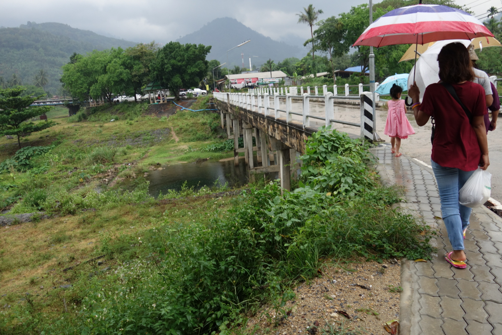 Auf jeden Fall bekommen wir Regenschirme und Tüten mit Früchten in die Hand gedrückt und laufen alle zusammen Richtung Dorf.