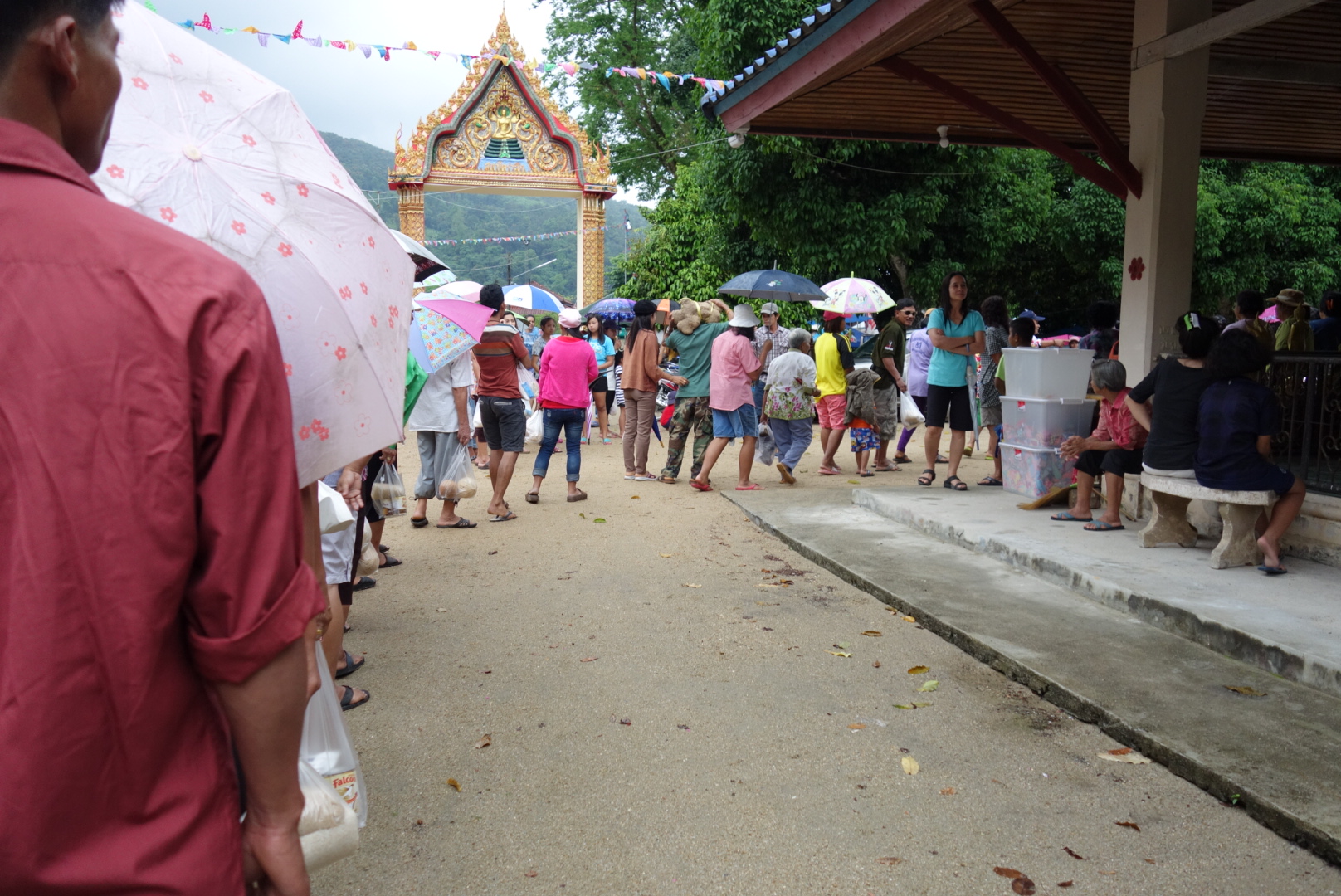 Unter den neugierigen Blicken der Einheimischen stehen also 2 Farang in der Schlange um essen zu spenden.