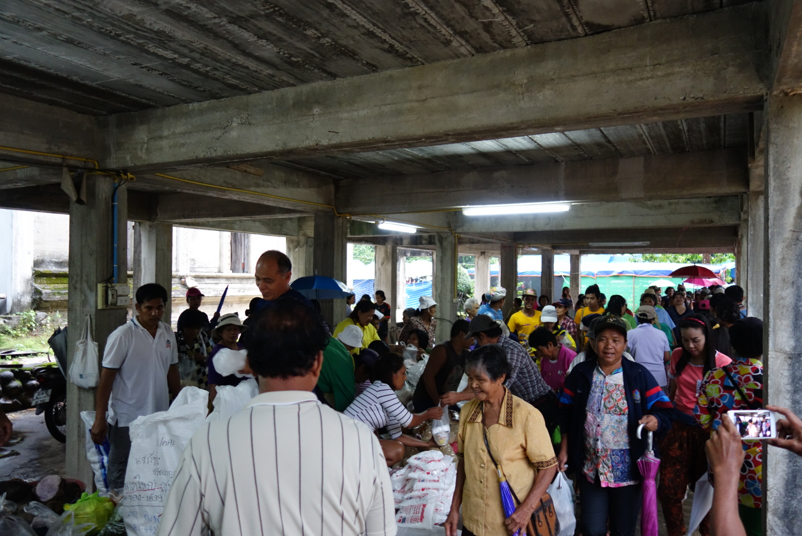 Hier ist schon richtig was los, hunderte Menschen mit Tüten stehen in einer langen Schlange und weil wir ja auch jeder eine Tüte in der Hand halten, stellen wir uns hinten an.