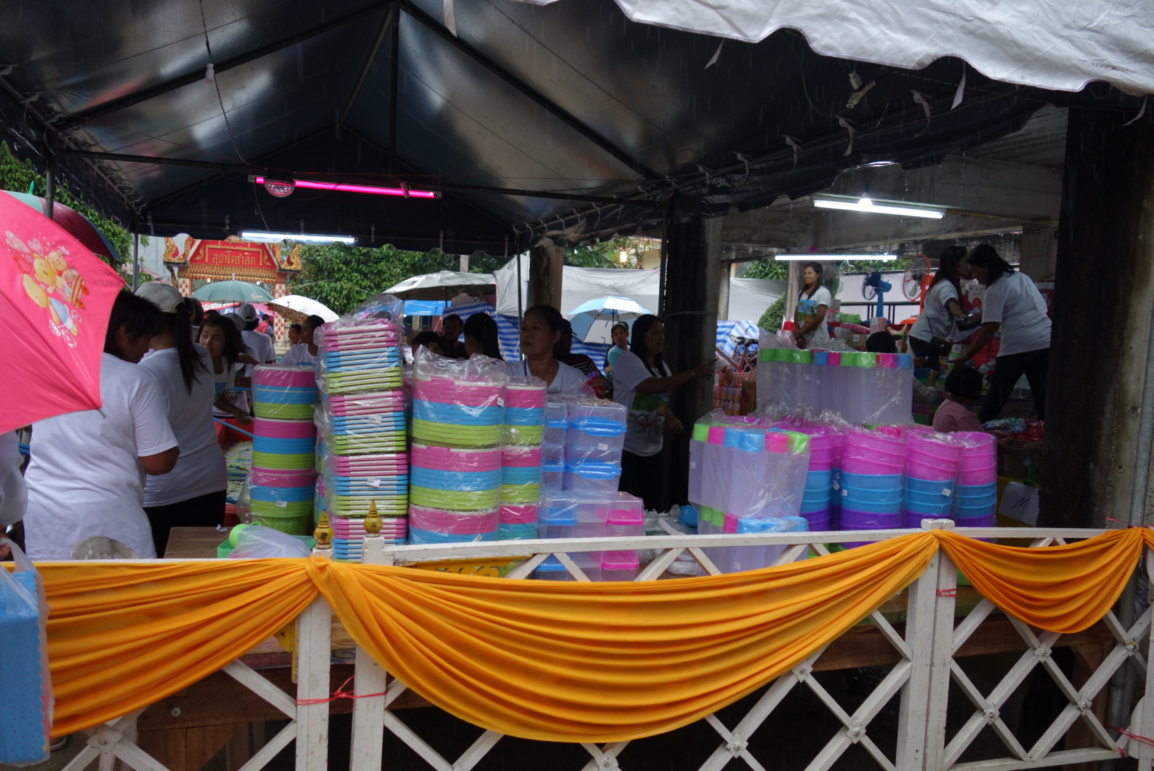 Bei einer Art Losbude gewinnen wir 2 Flaschen Wasser und eine hässliche Plastikschüssel und wir decken uns gut mit Essen und Süßigkeiten ein, die wir später am Bungalow verputzen wollen.