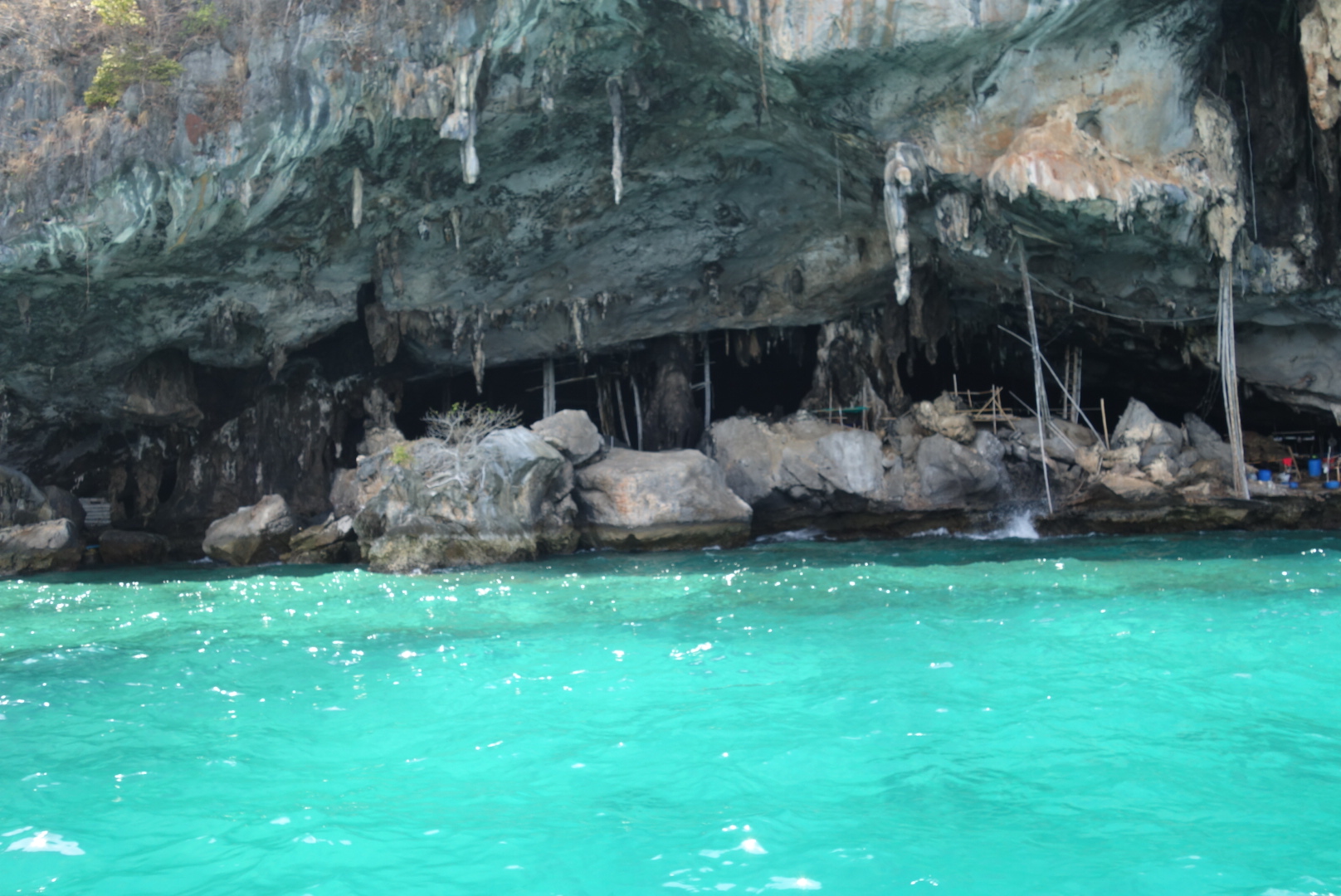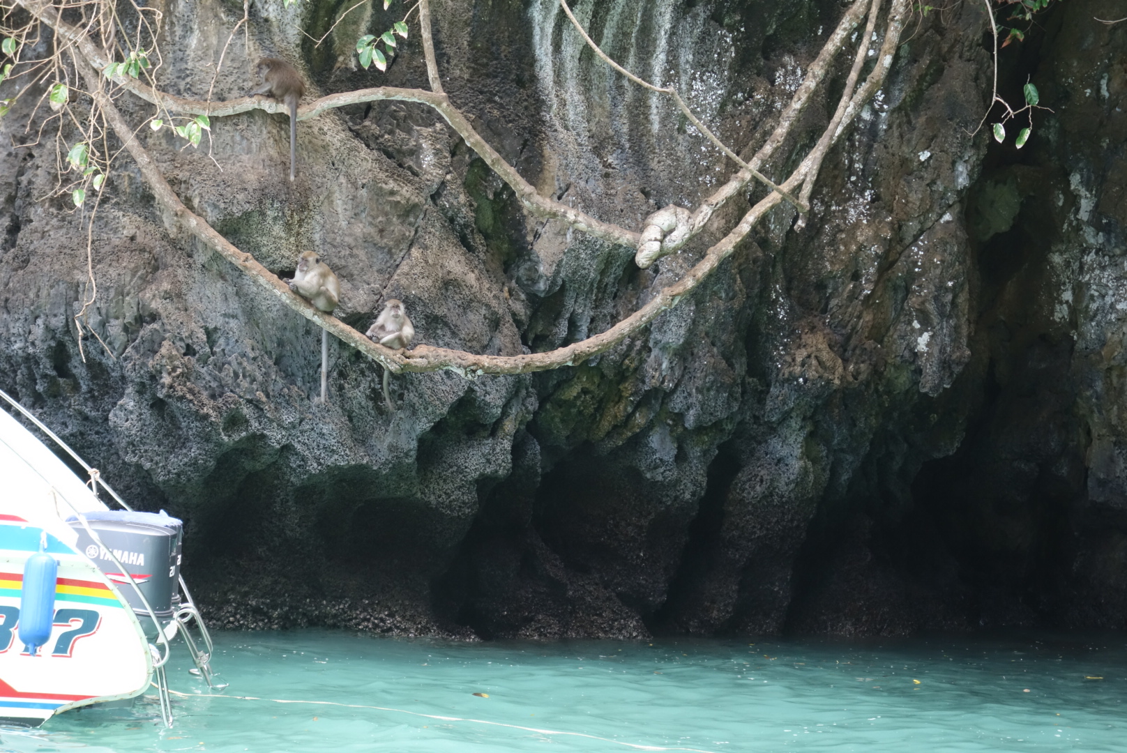 Dann geht es weiter vorbei an einer Höhle und an Felsen die von Affen in Beschlag genommen wurden nach Koh Pi Pi zum Mittagessen.