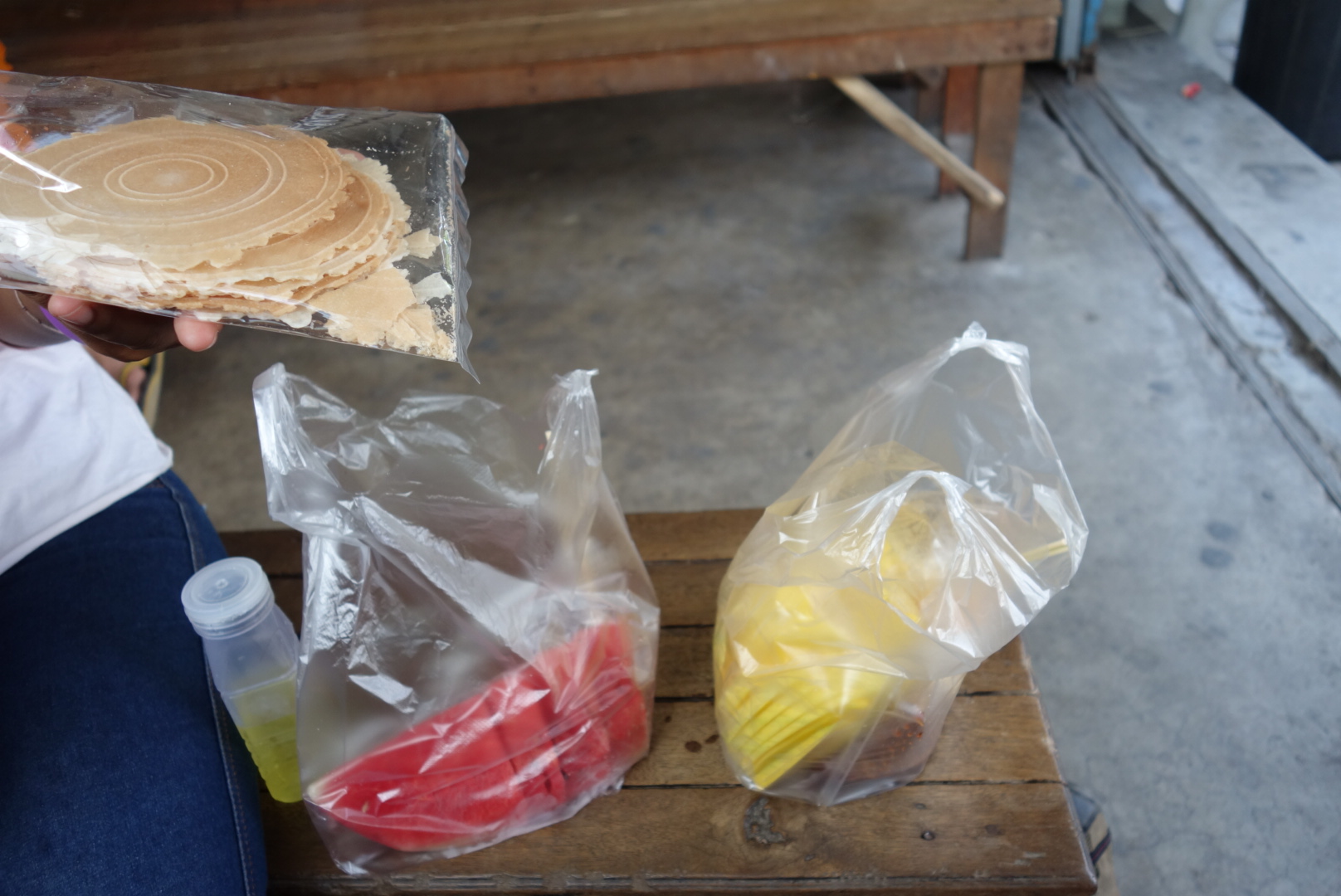 Weil wir mitlerweile 12 Kilometer von unsrem Bungalow entfernt sind und es langsam Dunkel wird, besorgt Bonny haufenweise Essen, das wir in meinen Rucksack packen.