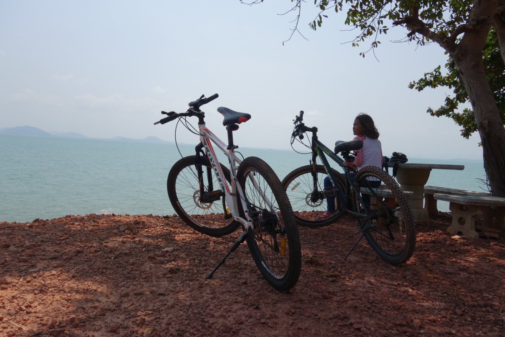 Bis zum späten Nachmittag radeln wir durch die Gegend und machen eine ewig lange Pause an einer Bank mit Meerblick.