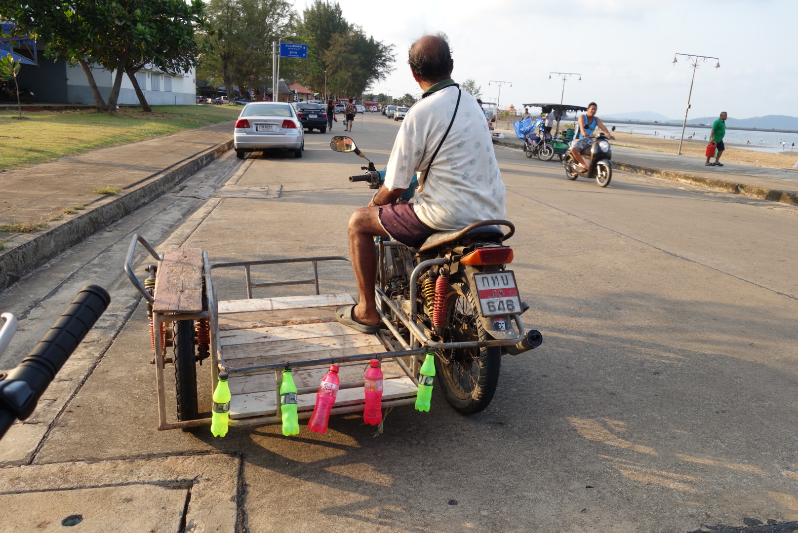 Irgendwann fährt ein Motorrad mit Anbau (ich hab echt keine Ahnung wie ich die Dinger nennen soll, Thai nennen die Dinger laut Bonny „Saleng“) neben uns her und der Mann der das Teil fährt meint, das er uns ein Stück mitnehmen kann.