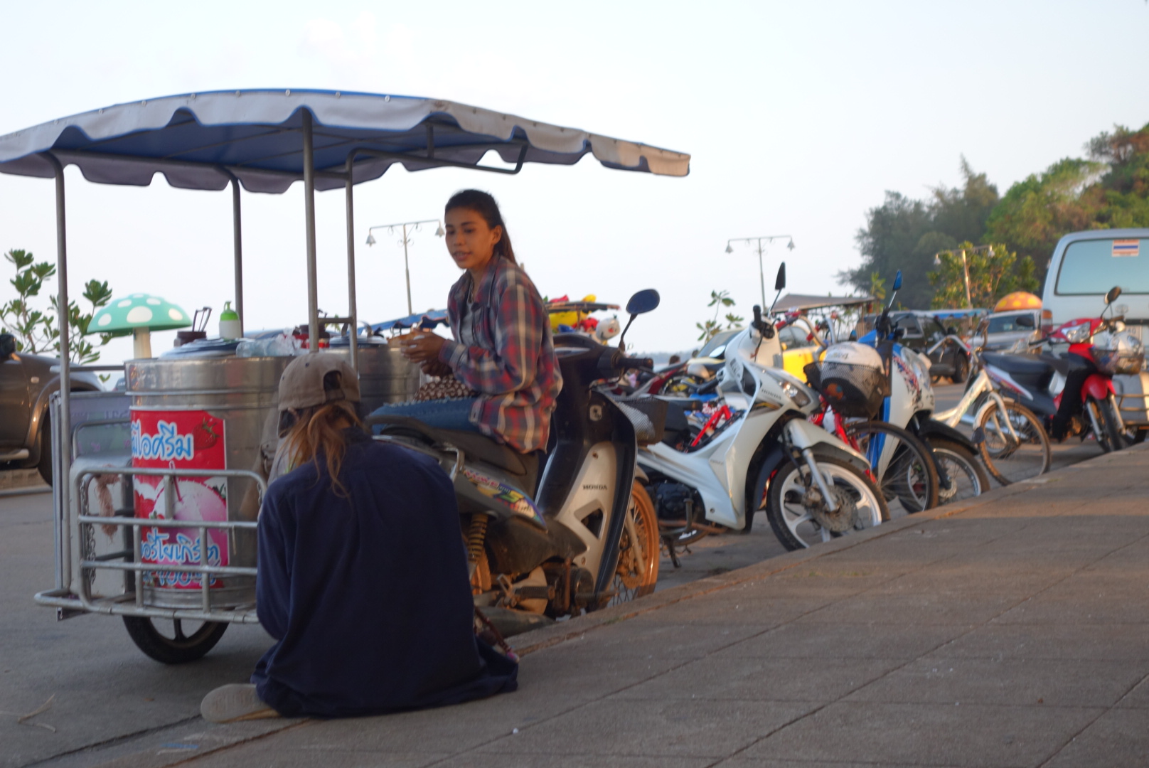 Gegen 17 Uhr erreichen wir eine Stadt namens Chumphon und wie bestellt steht auf der anderen Seite der Straße ein Sammeltaxi (eins von der großen Sorte, Sammel-Lkw würde auch passen).