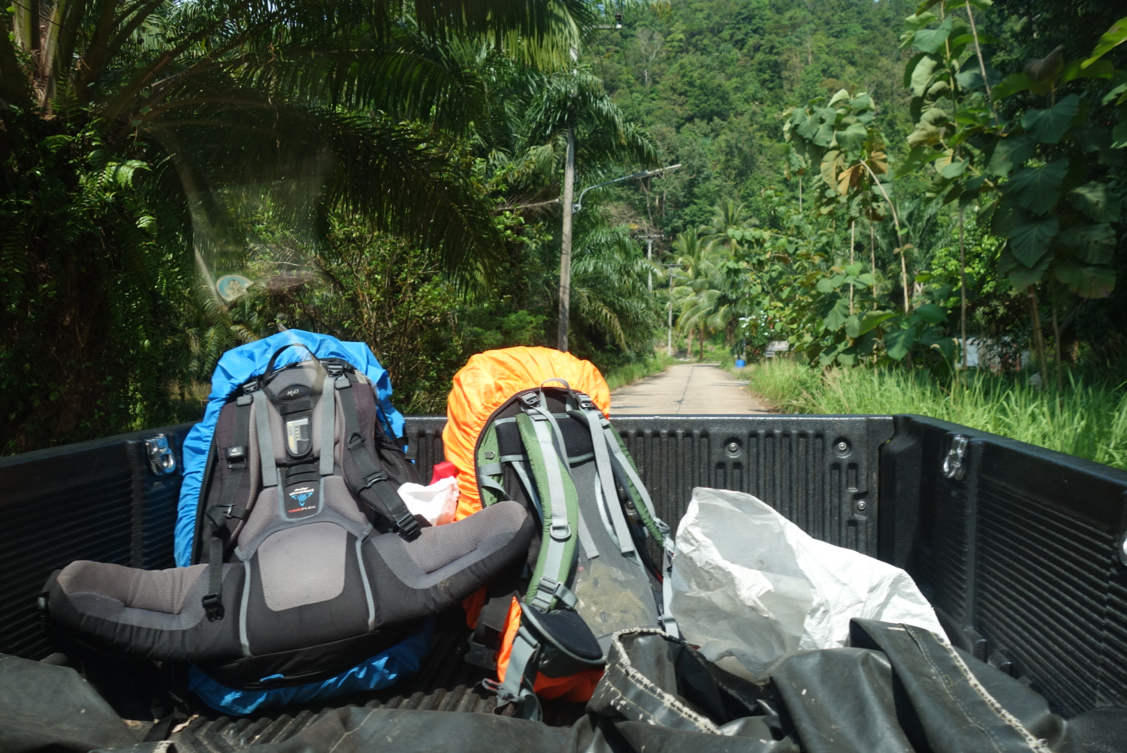 Auch wenn die Räder eigentlich zu groß für die Ladefläche des Saleng sind, schaffen wir es uns und unsere Drahtesel auf das Teil zu wuchten und wir tuckern los.