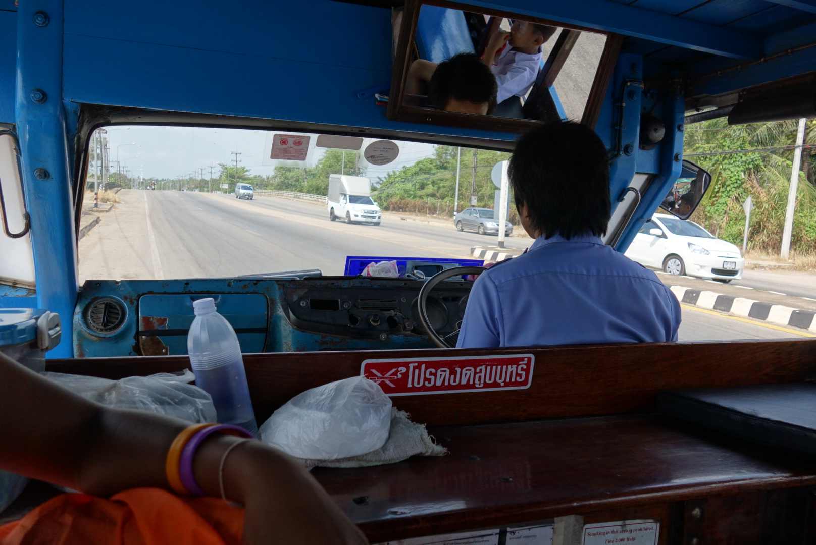 Bonny spricht mit dem Fahrer und dieser erklärt sich bereit uns für 40 Bath pro Person sogar bis zum Bahnhof zu fahren.