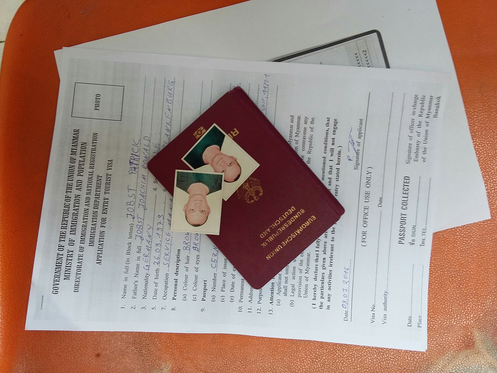 Um ein Visum für Myanmar zu bekommen braucht mal außer seinem Reisepass noch 2 Passbilder, eine Kopie des Reisepasses und einen bzw 2 ausgefüllte Fragebögen.