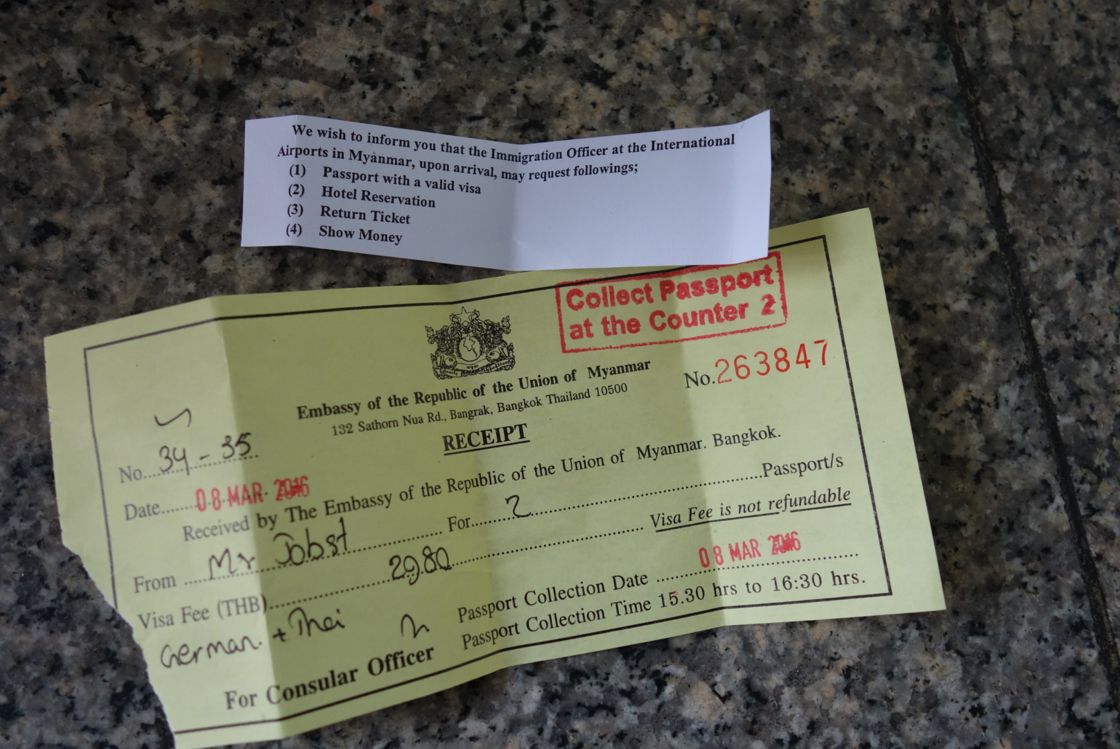 Bis auf ein Rückflug Ticket haben wir also alles Nötige für eine Reise nach Myanmar zusammen.