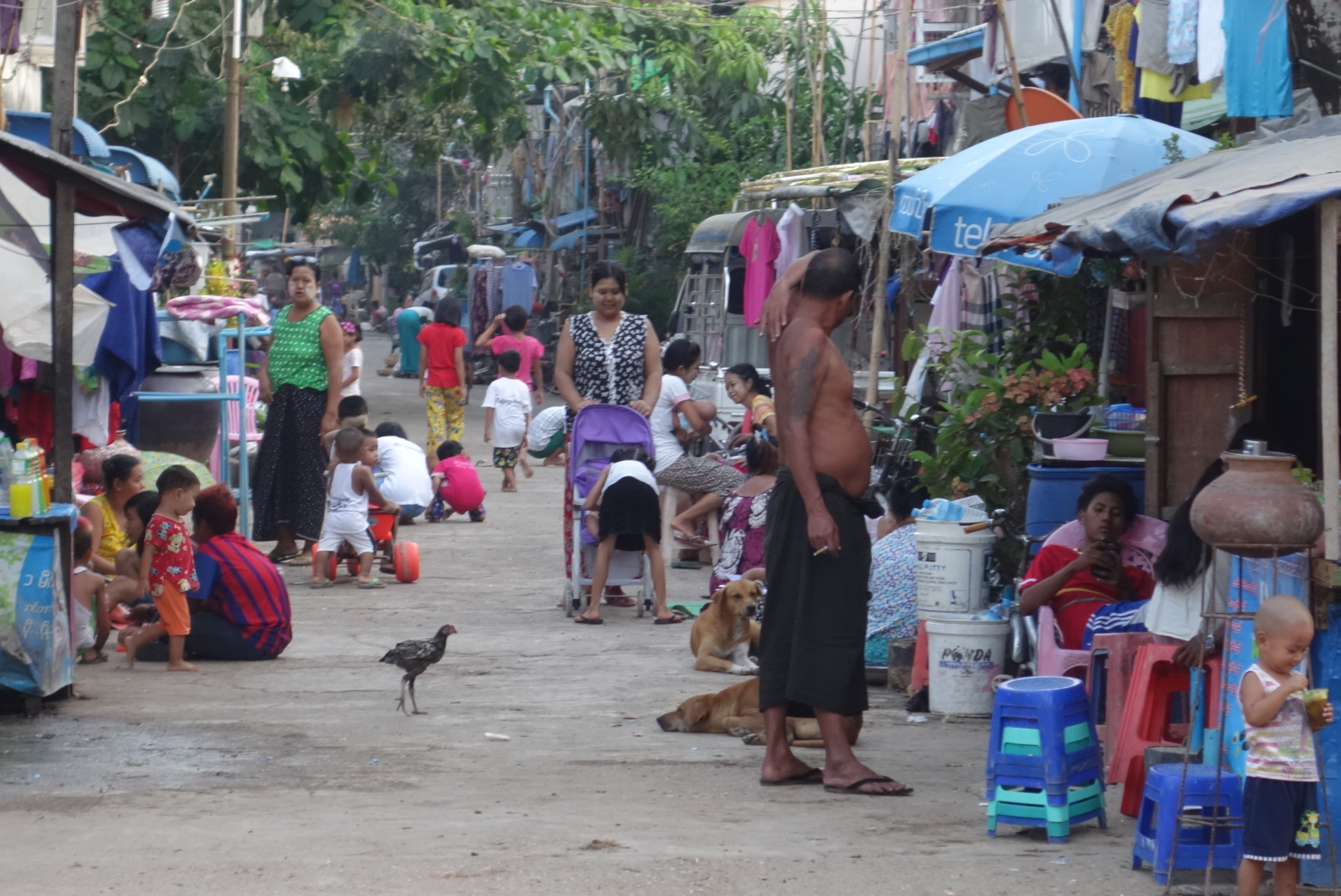 Kinder spielen Fußball, Frauen waschen Wäsche, Haare werden geschnitten und und und.