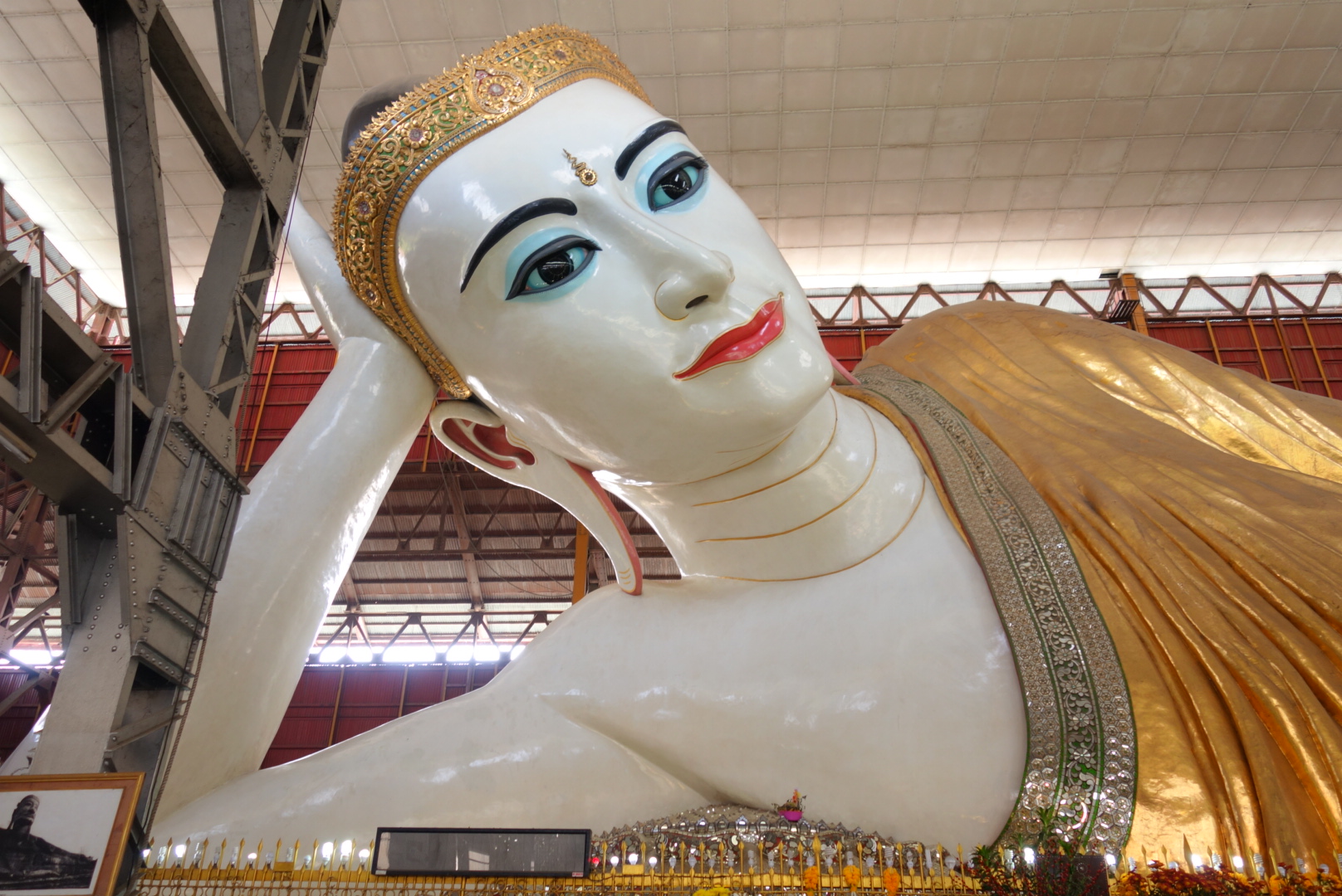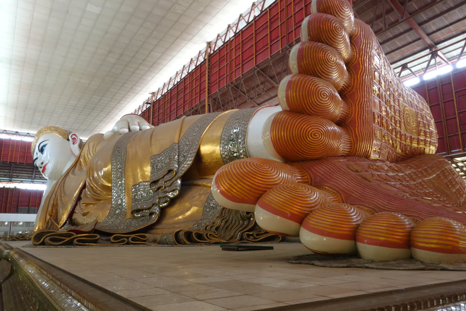 เช้าวันนี้เราวางแผนไว้ว่าจะเดินเที่ยวใกล้ๆที่พัก โดยเริ่มที่ ทะเลสาบอินยา(Kan Tha Ya) ที่นี้คือสวนสาธารณะที่ถูกสร้างขึ้นมา วันแรกที่มานั่งรถแท็กซี่ผ่านดูใหญ่และสวยดี จึงตัดสินใจมาเดินดูแต่ช่วงเวลาที่เราเดินนั้นคือช่วงกลางวันซึ่งร้อนตับแตก สู้แดดไม่ไหวคะเลยเลี้ยวกลับเพื่อที่จะหนี้ร้อนไปพึ่งเย็นแทน นั่นคือวัด ทะเลสาบอินยาเป็นสวนสาธารณะอีกที่หนึ่งในเมืองย่างกุ้งที่มีคนมาวิ่งออกกำลังกายกันและมานั่งพักผ่อน และค่อนข้างสะอาดใช้ได้คะ หลังจากที่เราเลี้ยวกลับเพื่อไปวัดเจ๊าทัตจี (วัดพระตาหวาน) Chauk Htat Gyi Pagoda เป็นพระพุทธรูปปางไสยาสน์(พระนอน) องค์ใหญ่ สูงปประมาณตึก6 ชั้นได้ เราเดินตามทางใหญ่ซึ่งแน่นอนรถราดูวุ่นวายมาก ปวดหัวขึ้นมานิดหน่อยเพราะอากาศร้อนด้วยและเสียงแตรรถด้วย สักพักไม่ไหวจึงพากันหลบไปหาแอร์ในร้านกาแฟนั่งกินนั่งเล่นพักใหญ่จึงตัดสินใจเลือกเดินไปตามซอยเล็กๆเผื่อเจอร่มเงาและที่สำคัญหลีกเลี่ยงเสียงแตรรถด้วย ถือว่าตัดสินใจถูก เพราะในซอยสงบกว่าแต่ใช่ว่าจะหนีเสียงแตรรถได้ รถขับมาคันเดียวไม่มีอะไรยังกดแตรเลย หรือแค่นกตัวเดียวอยู่บนถนนก็ยังกดแตรไล่ อ๋อ!ที่สังเกตได้อีกอย่างคือทุกที่ในย่างกุ้งมีแต่อีกาดำเต็มไปหมด เสียงร้องของมันไม่ชอบเลยจริงๆ บินลงมาแต่ละทีอ้าปากค้างไม่รู้ว่าอ้าปากไว้ทำไม ดูเหมือนอยู่ในเมืองแม่มดไงงั้นอะเหมือนเมืองต้องคำสาป เราเดินหลบแดดไปเรื่อยๆก็เจอวัดคะ วัดแรกที่เราสัมผัสดูสวยแปลกตาดี ใหญ่ แต่ทำไมถึงไม่รู้สึกเย็นเหมือนวัดไทยก็ไม่รู้ มีลมเย็นนิดหน่อยคะ แต่ไม่เย็นสบายเหมือนที่วัดเรา ตอนเข้าวัดต้องสังเกตุผู้คนด้วยว่าเค้าใส่รองเท้าหรือเปล่า ถ้าไม่นั่นหมายความว่าเราต้องถอดรองเท้าตั้งแต่ตรงนั้น ปกติเราต้องถอดตั้งแต่หัวบรรไดวัดเลยคะ ถ้าใส่ถุงเท้าก็ต้องถอดด้วยนะคะ เดินเท้าเปล่าเท่านั้นคะ จากปากทางภายในวัดต้องเดินขึ้นศาลาแต่ละชั้นจนถึงชั้นบนสุด ความรู้สึกแรกที่เห็นโอ๋!ว๊าว! ใหญ่มาก และมองไปที่ดวงตาท่านใส่และสวยจริง เหมือนพระสมัยใหม่ที่ต้องแต่งตัวสวย ตอนแรกกะจะนั่งนานๆเพราะข้างนอกร้อนเหลือเกิน แต่นั่งไปสักแปปรู้สึกว่าไม่มีลมเลยเปล่่ยนทิศไปนั่งใกล้พัดลม แต่รู้สึกว่ามีกลิ่นไม่ค่อยดี น่าจะเป็นกลิ่นน้ำหมากพลู ทนไม่ได้เลยต้องออกเดินไปจุดหมายต่อไป คือวัดงาทัตจี Nga Htat Gyi Pagoda ซึ่งอยู่ตรงข้ามกับวัดเจ๊าทัตจี(พระตาหวาน) ไม่ไกล้กันมากเดินพอได้เหงื่อคะ ที่นี่จะมีพระพุทธรูปองค์ใหญ่ทรงเครื่องราชย์และด้านหลังฉากจะมีประติมากรรมแกะลายสลักจากไม้สั